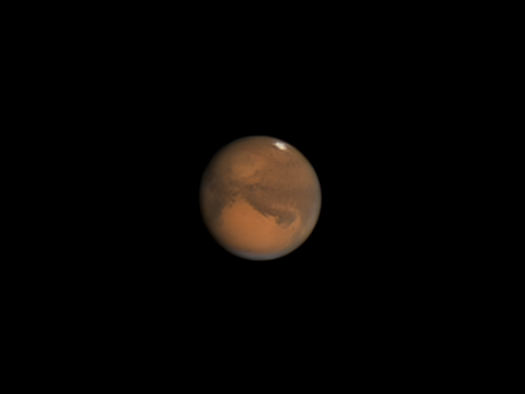 Bei sehr wechselndem Seeing und ganz schlechter Durchsicht gelang mir gegen kurz vor 23 Uhr Ortszeit diese Aufnahme des Roten Planeten. Man erkennt gerade noch so die Syrtis Major sowie die Sinus Sabaeus und die die Sinus Meridiani.