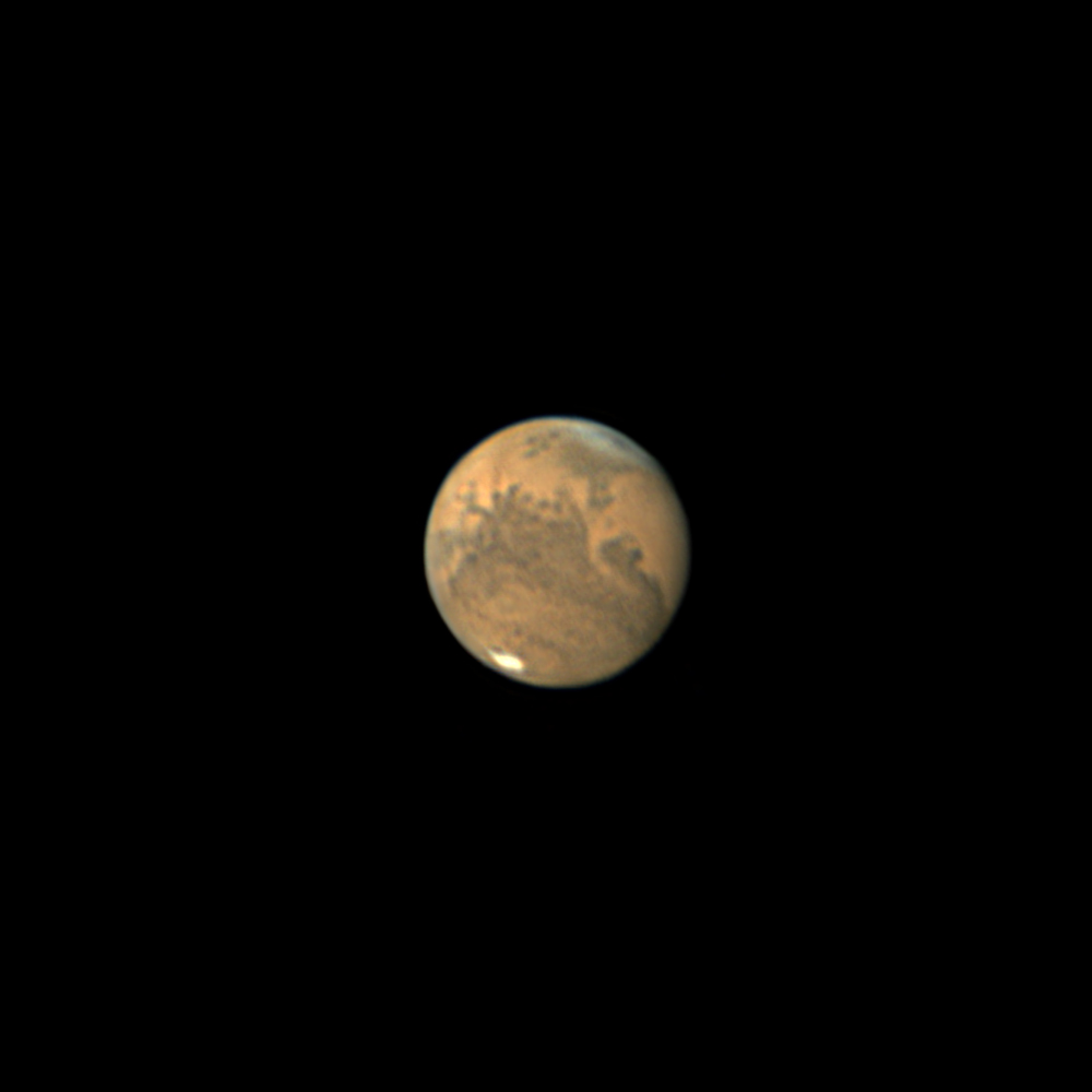 Am Morgen des 22. September 2020 hatte ich endlich einmal das erhofft gute Seeing für meine Verhältnisse im Maintal. Visuell war Mars ein Genuss im Binokular bei 300-facher Vergrößerung. Fast noch schöner wurde der Anblick unseres roten Nachbarn auf den Bildern, die ich einfangen konnte.