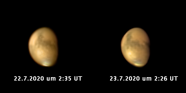 Zu einer ähnlichen Uhrzeit nahm ich Mars am 22. und 23. Juli 2020 auf. Dabei ist schon die längere Rotationsperiode des Mars zu erkennen. Die große Syrte, das Hellasbecken und andere Oberflächendetails sind deutlich nach links versetzt. Die Größe des Marsscheibchens betrug 13,6" bei einer Helligkeit von -0,6 mag.