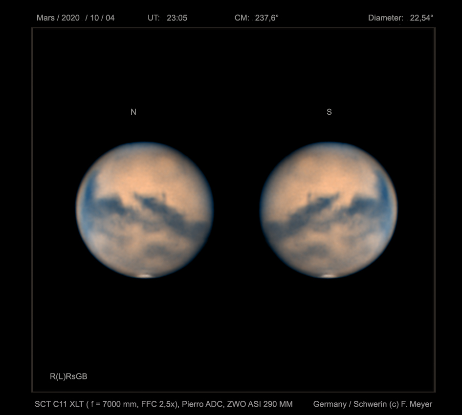 Marsaufnahme mit einem SCT C11 bei eher schlechtem "Seeing". Von RGB-Videos mit 10000 bis 25000 Frames wurden für die weitere Bildbearbeitung 34 bis 40 Prozent der Einzelbilder genutzt. Blaue Wolken über Syrtis Major und im Bereich der Nordpolhaube und das Mare Cimmerium und Elysium sind trotz der nicht optimalen Aufnahmebedingungen sichtbar.