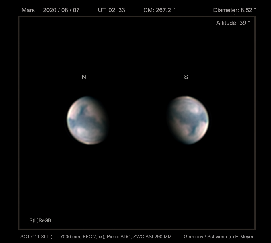Obwohl der Planet Mars zum Aufnahmezeitpunkt nur einen scheinbaren Durchmesser von 8,5 Bogensekunden hatte, sind mit einem SCT C11 trotzdem schon Details erkennbar. In diesem Bild ist es vor allem "Syrtis Major". Mit der Software FireCapture wurden 2 min Videos im RGB mit rund 5000 bis 8000 Frames aufgenommen und pro Kanal 25 % genutzt.