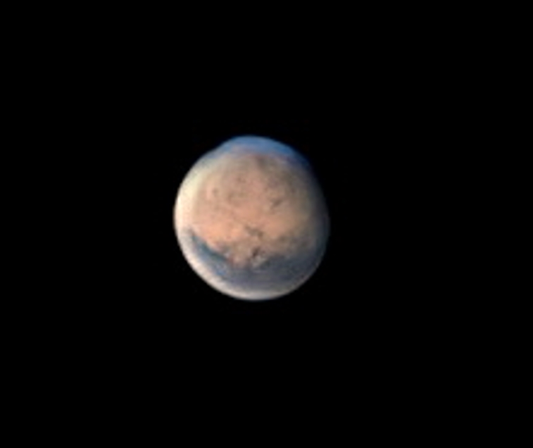 Mars mit dem SC 8-Teleskop: Morgens um halb 4 gibt es eine vorhergesagte Wolkenlücke, da klingelt der Wecker! Gut, dass ich inzwischen pensioniert bin, so stört der fehlende Schlaf nicht. Leider heftige Windböen in Niedersachsen, aber trotzdem schaffen es die Astroprogramme, aus den 10000 frames die besten 20% zu einem immer wieder erstaunlichen Bild zusammenzusetzen. Oben links erkennt man sogar ansatzweise den riesigen Marsvulkan Olympus Mons, 27 km hoch, aber sehr flach, die Basis hat etwa 550 km Durchmesser. Trotz des sehr mäßigen Seeings: Das wollte ich doch mal versuchen, den festzuhalten.