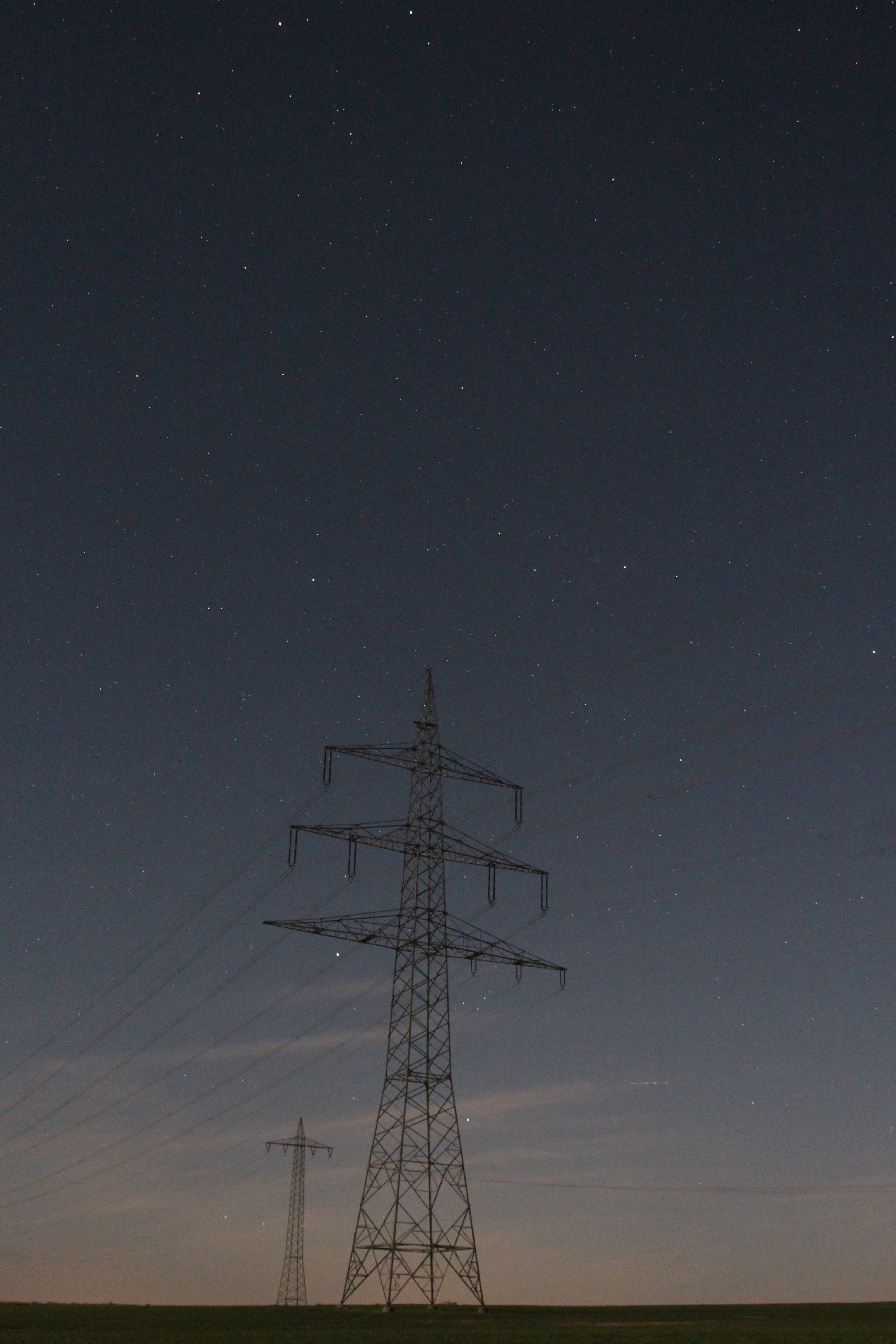 Mars am Abendhimmel im Sternbild Zwillinge nahe des Sternhaufens M 35. Im Vordergrund sieht man den Mast 86 der Hochspannungsleitung Pulverdingen-Oberjettingen und dem Mast 7624 der Bahnstromleitung Zazenhausen-Eutingen.