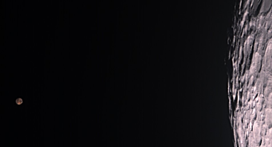 Am 9. Februar 2025 begegnete der Mars dem Mond. Mit bloßem Auge kaum trennbar, konnte ich trotz leichter Bewölkung dieses Bild aufnehmen.