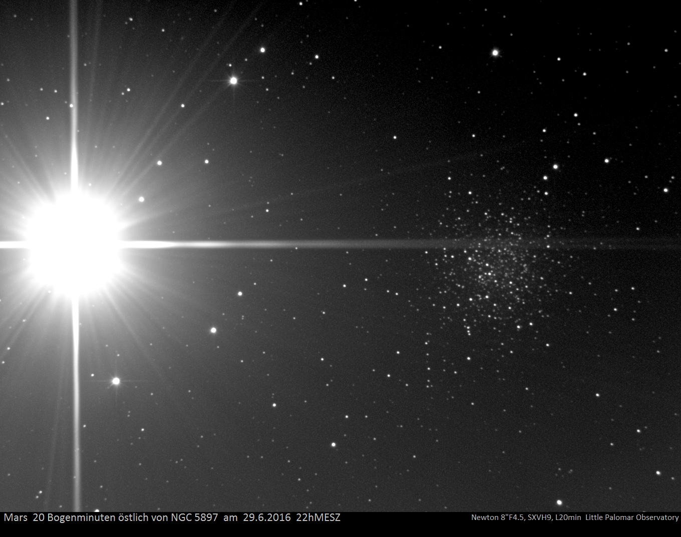 (Erinnerung ausgelöst durch die Aufnahme des ChamäleonTeams!) Am 29. Juni 2016 wollte ich endlich diesen interessanten Kugelsternhaufen aufnehmen, Als ich ihn nach Goto-Suche im Visier hatte, blendete mich ein heller Schein. Es war Mars, damals zur Oppositionszeit. Eine seltene Überraschung!