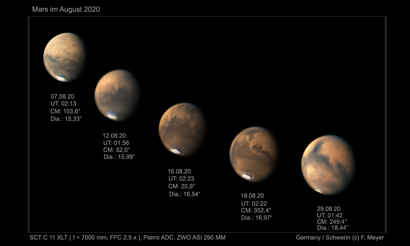 Zusammenstellung meiner Marsaufnahmen im August 2020. Alle Aufnahmen erfolgten mit einem SCT C 11 und der Software "FireCapture". Weitere Angaben im Bild.