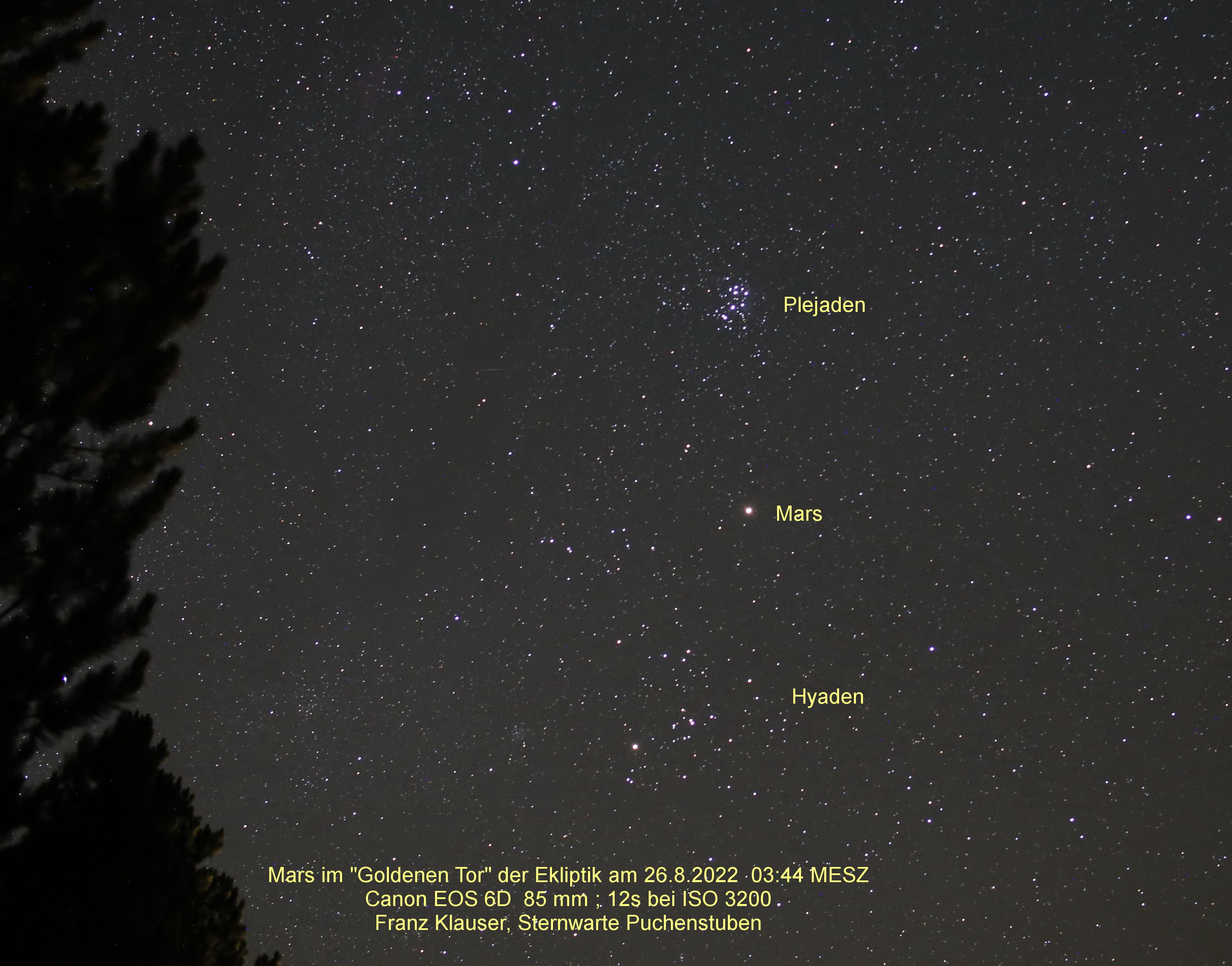 Die Nacht vom 25. auf den 26. August 2022 war astronomisch hervorragend. Auch die Planeten standen entlang der Ekliptik aufgefädelt, ganz links in der Reihe der Mars im Goldenen Tor der Ekliptik. Neben der Sonne wandern auch die Planeten entlang der Ekliptik und damit auch hin und wieder durch diese Stelle am Himmel.