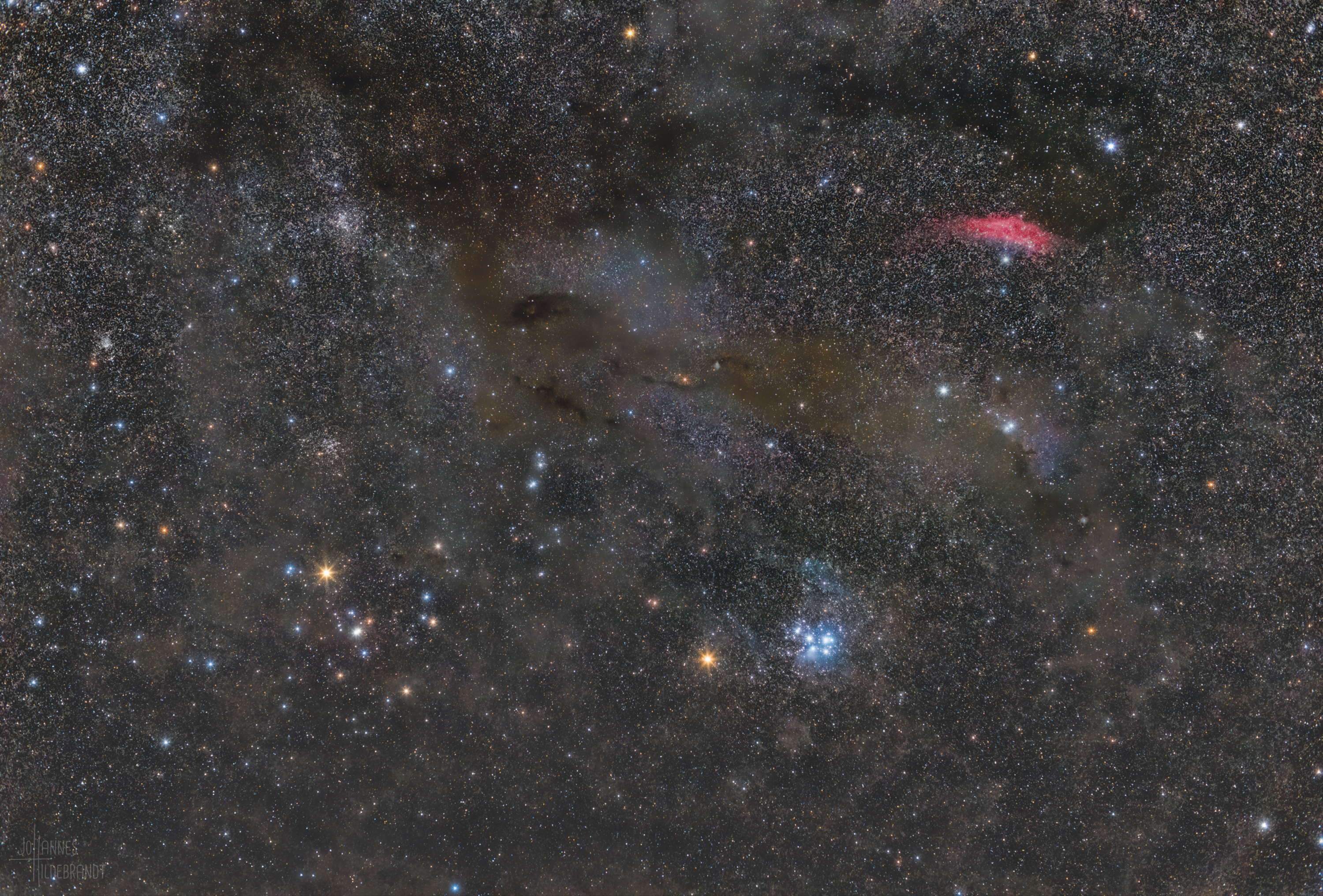 Inspiriert von einem Bild bei APOD wollte ich versuchen, diesen Bereich und die attraktive Konstellation von Mars im Stier abzulichten. Mit relativ wenig Aufwand und Equipment sind derartige Aufnahmen möglich - die Kunst dabei ist es, die schwachen Bereiche der Molekülwolken und Dunkelnebel sichtbar zu machen und zu betonen. So übersteigt die Zeit der Nachbearbeitung die der reinen Aufnahme erheblich.