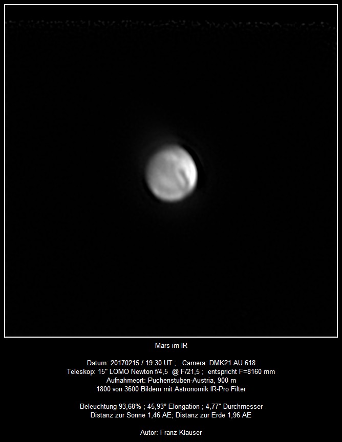 Zum Aufnahmezeitpunkt war der Rote Planet 1,95 Astronomische Einheiten (291 Millionen Kilometer) von der Erde entfernt und hatte einen scheinbaren Durchmesser von nur 4,8 Bogensekunden. Meine Erwartungen, Oberflächendetails im IR-Bild zu finden, waren nicht sehr hoch. Der Südpol ist links unten.