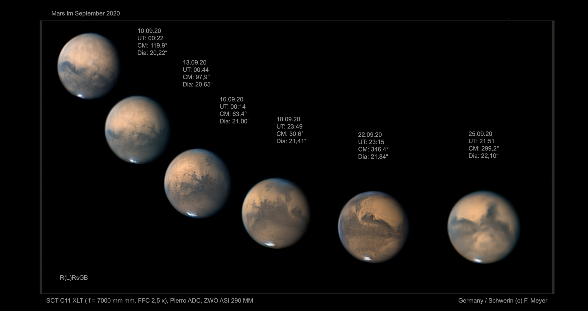 Zusammenstellung einiger meiner Marsaufnahmen im September 2020. Aufnahme der RGB-Videos mit einem SCT C11 und der Software "FireCapture". Von 2 min Videos mit 6000 bis 13000 Frames wurden 33 bis 40 Prozent der Einzelbilder für die weitere Bildbearbeitung genutzt.