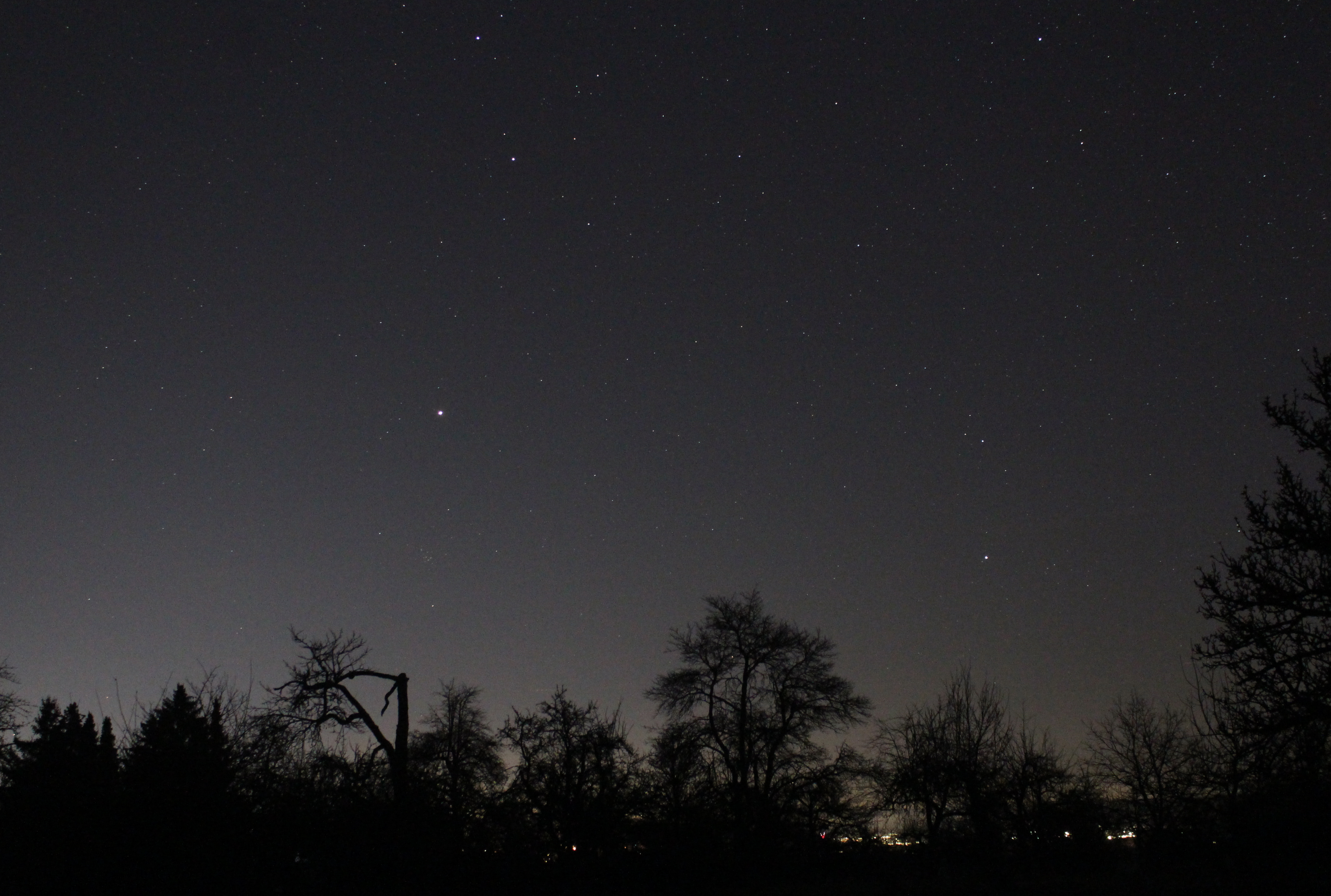 Mars im Sternbild Krebs mit den Lichtern von Ehningen im Hintergrund.