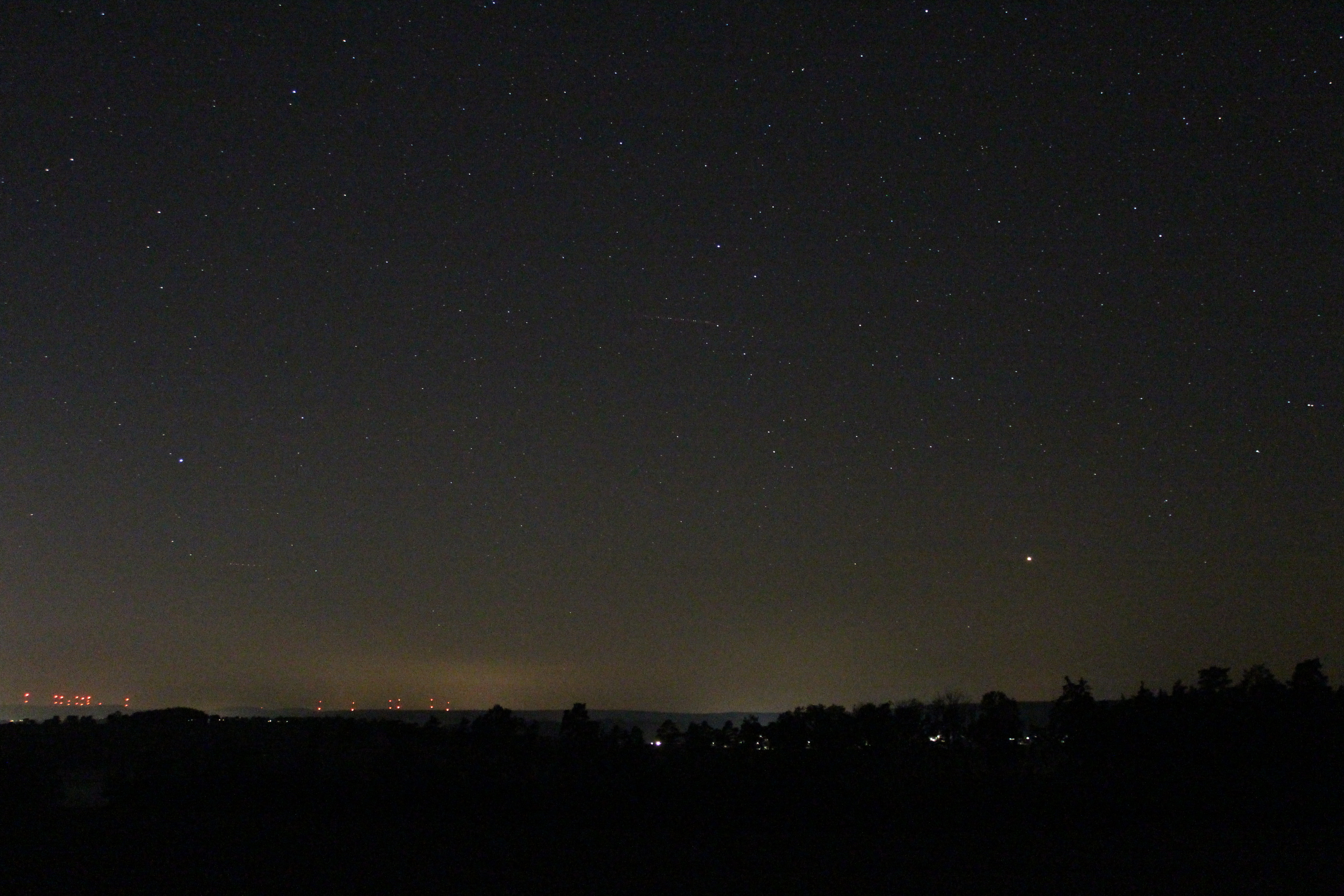 Mars im Sternbild Steinbock, welches kurz vor dem Untergang steht, aufgenommen nordöstlich von Wollbach in Unterfranken.