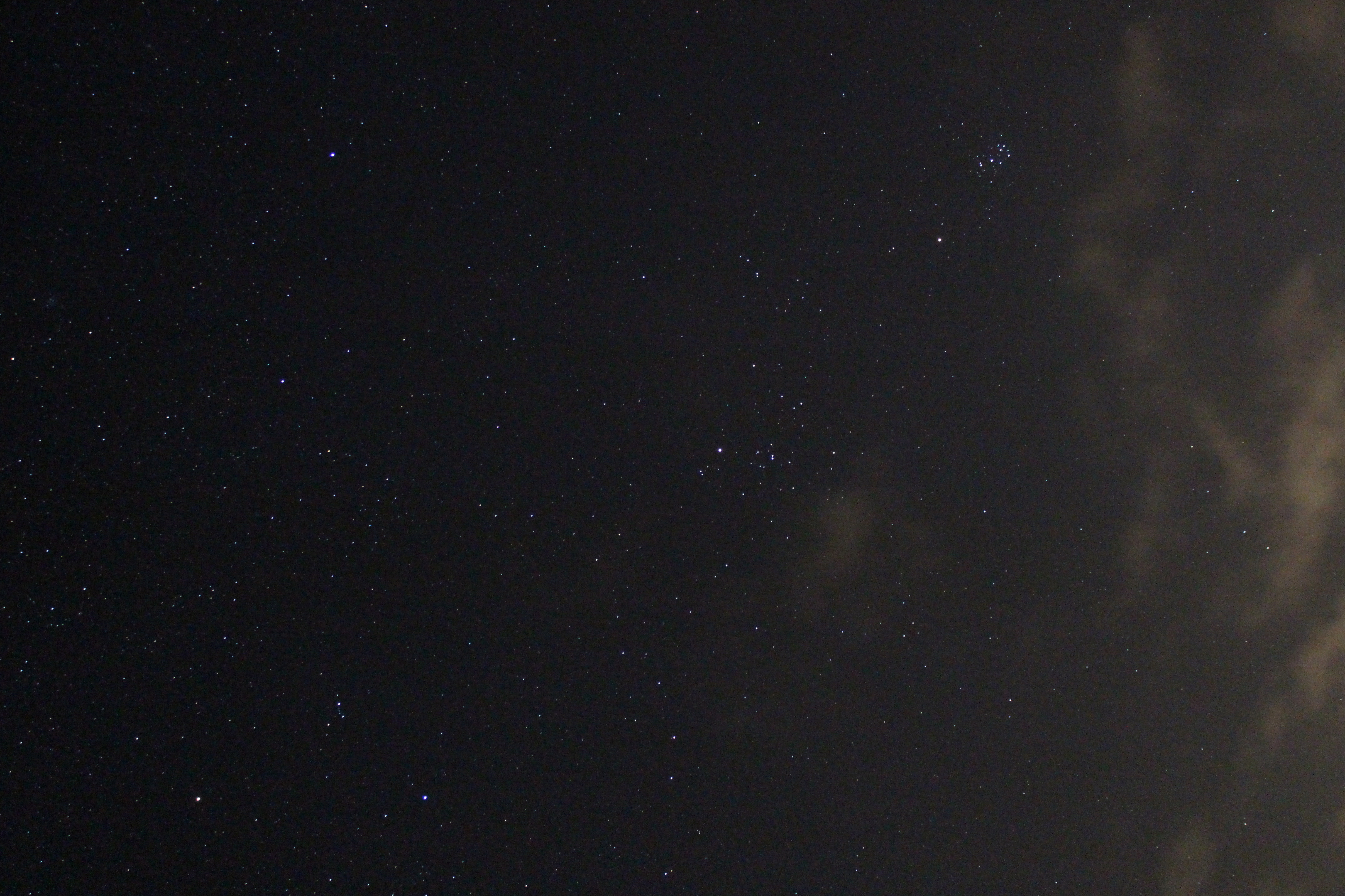 Mars im "Goldenen Tor" im Sternbild Stier, welches von den offenen Sternhäufen Plejaden und Hyaden gebildet wird. Leider ziehen am rechten Bildrand Wolken auf.