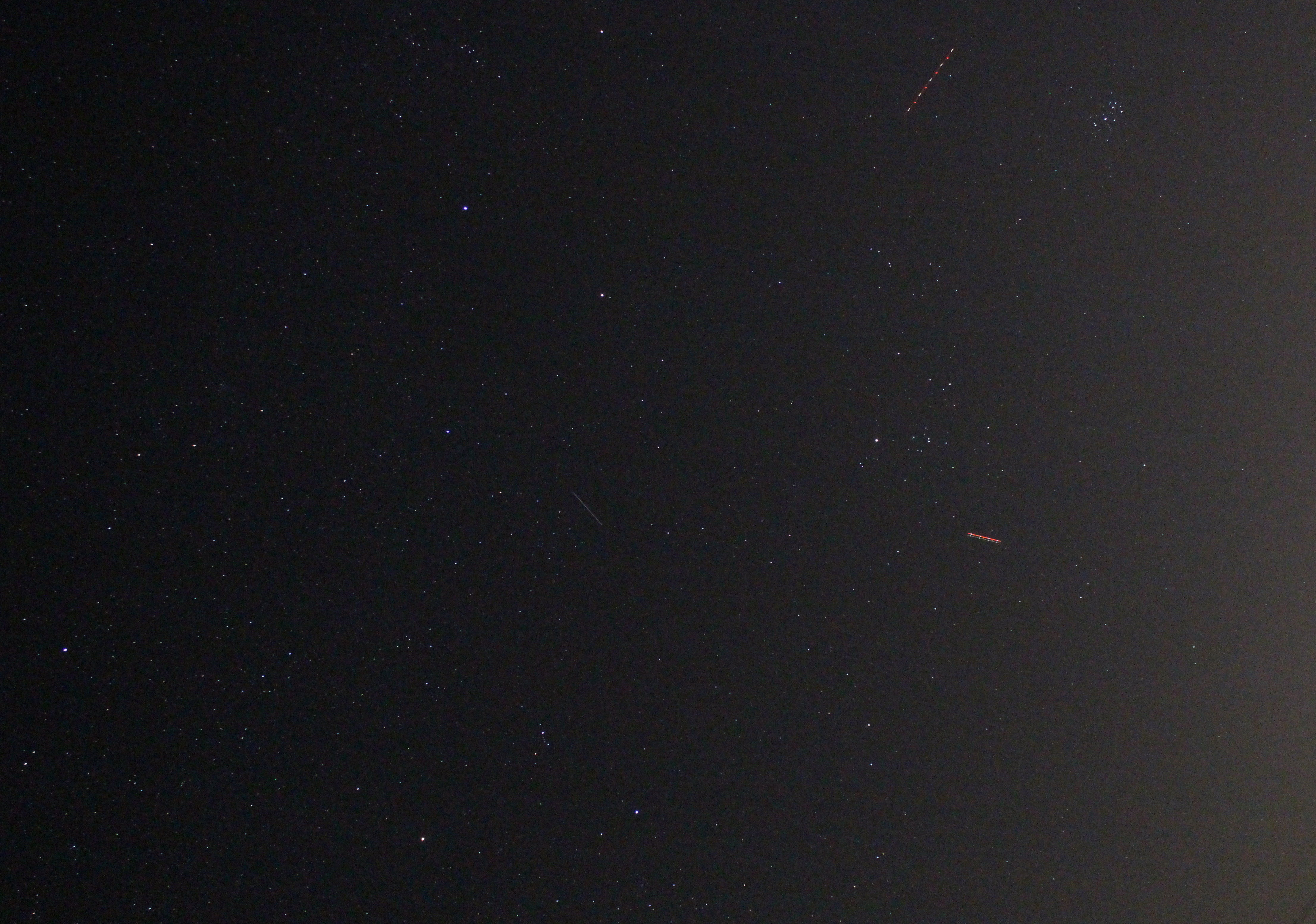 mit zwei Flugzeugspuren und einer Satellitenspur
