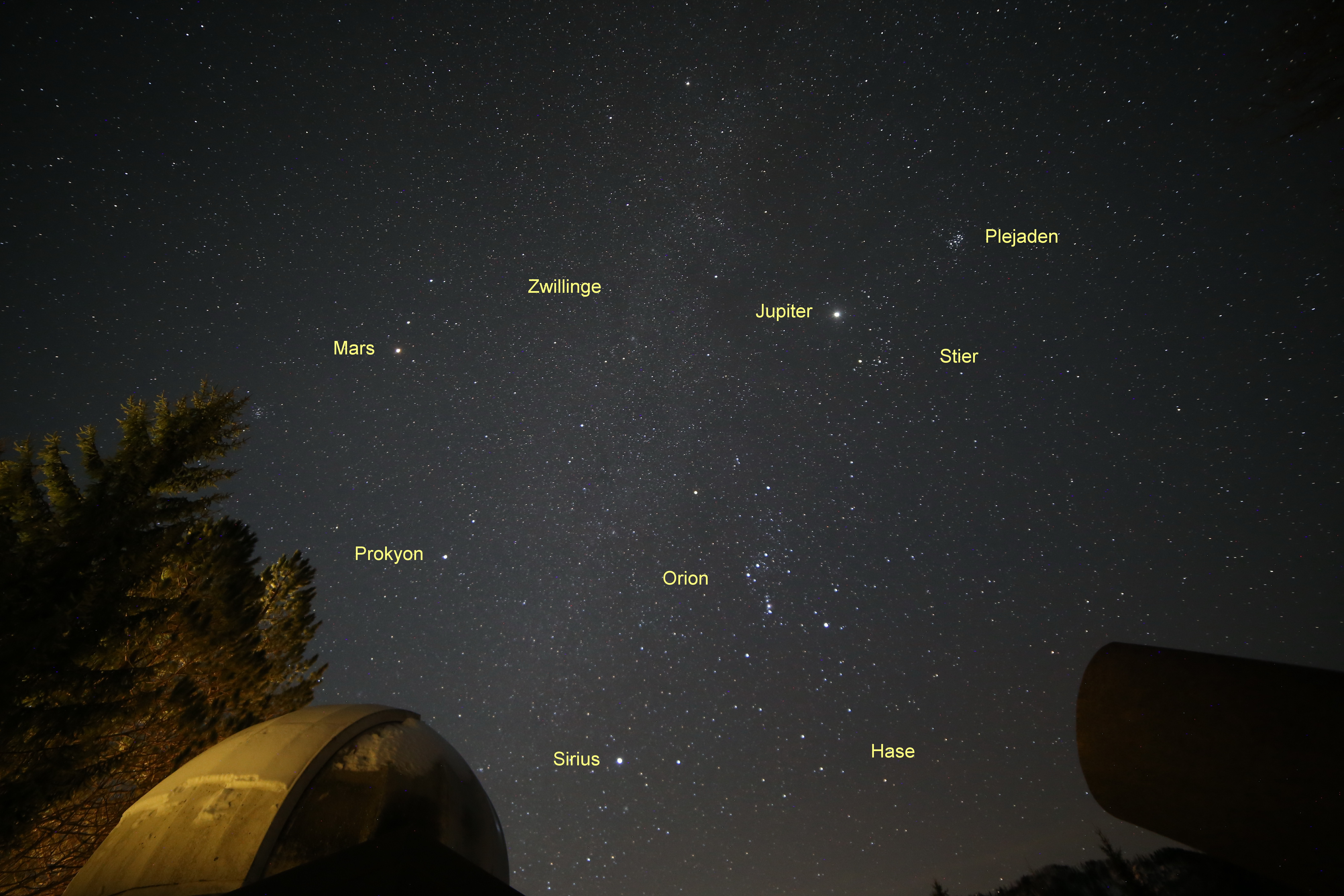In diesem Bild vom 18. Januar 2025 versammeln sich Mars und Jupiter am Abendhimmel, Mars im Sternbild Zwillinge und Jupiter im Sternbild Stier. Das Wintersternbild Orion vervollständigt die Szene. Im Verlaufe von zwei Stunden ist auch der Große Hund mit dem Hauptstern Sirius ins Bild gewandert. Aufgenommen in Puchenstuben, NÖ, bei meiner Sternwarte in 900 m Seehöhe.
