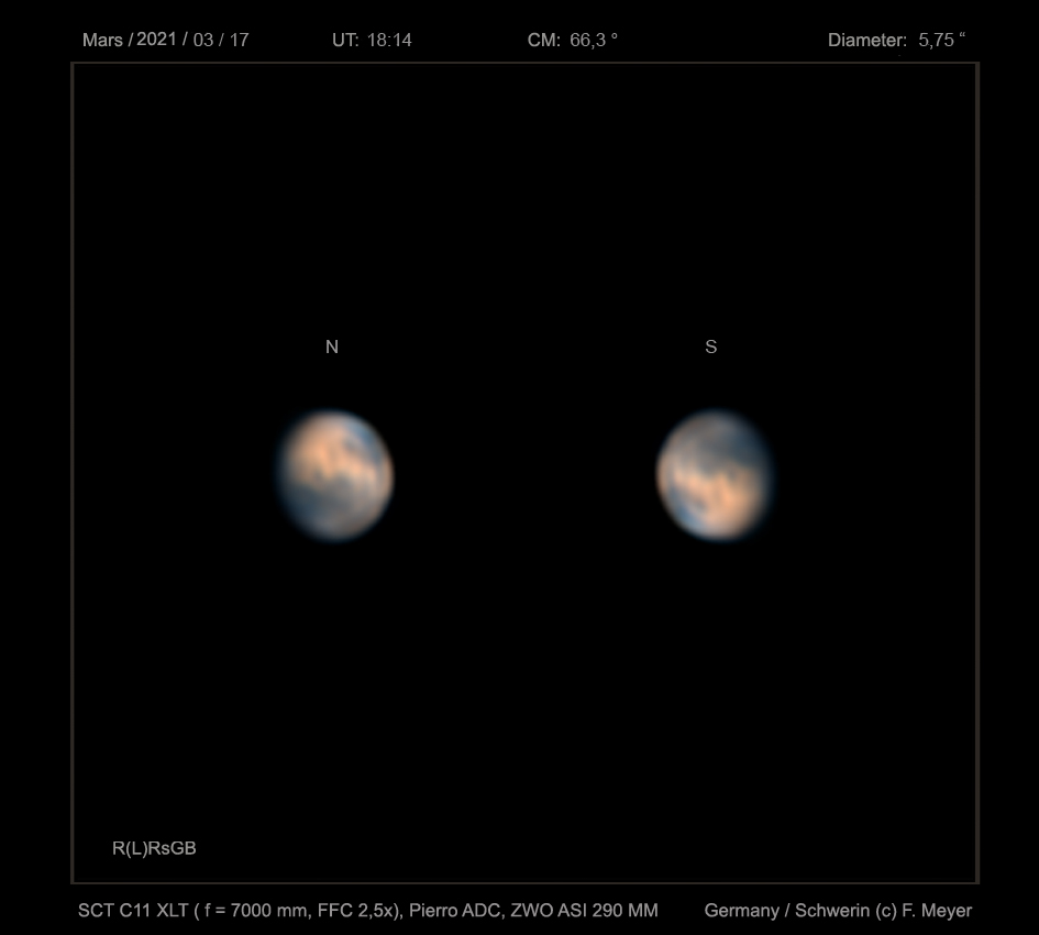 Bevor sich der Mars vom Abendhimmel verabschiedet, noch ein Bild. Trotz des kleinen scheinbaren Durchmessers von nur 5,8 Bogensekunden sind im SCT C11 noch Details zu erkennen. Von Zwei-Minuten-Videos im Rot- und Blaukanal mit etwa 15000 bis 7000 Frames wurden 34 Prozent für die Bildbearbeitung genutzt. Der Grünkanal ist aus 50 Prozent Rot- und 50 Prozent Blaukanalanteilen synthetisiert. Der Rotkanal dient auch als Luminanzbild.