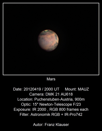 Trotz Phase und kleinem Marsdurchmesser gelangen am 19.4.2012 bei guter Luft einige Mars-Videos, aus denen brauchbare Marsbilder erstellt werden konnten. Deutlich ist am linken Rand Olympus Mons in seiner ganzen Ausdehnung zu erkennen. Diese Aufnahme entstand 75 Minuten nach der vorherigen.