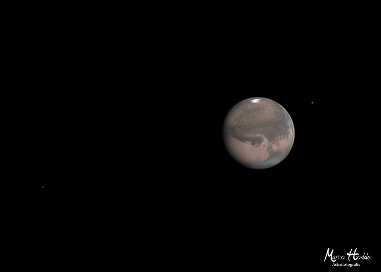 In der Nacht vom 21. auf den 22. September 2020 habe ich erst die beiden Begleiter vom Mars durch ein überbelichtetes Video sichtbar gemacht und anschließend nochmal den Mars selbst. Nach der anschließenden Bearbeitung habe ich die beiden zusammengefügt.