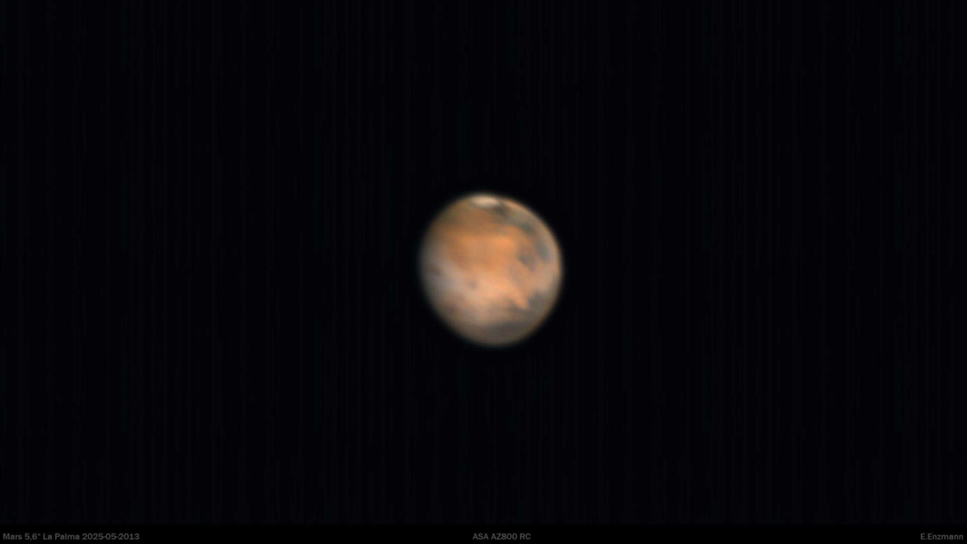 Das Seeing in La Palma war am 29. Mai 2025 stellenweise sehr gut und deswegen habe ich ausnahmsweise mit der vollen Teleskopöffnung den mittlerweile nur noch 5,6 Bogensekunden großen Mars aufgenommen. Nicht wie eigentlich fast immer mit der 1/4 Öffnung die so gut wie immer bessere Ergebnisse bringt als die volle Öffnung. Diesmal war aber das Seeing gut genug, um mit dem gesamten Spiegel aufzunehmen.