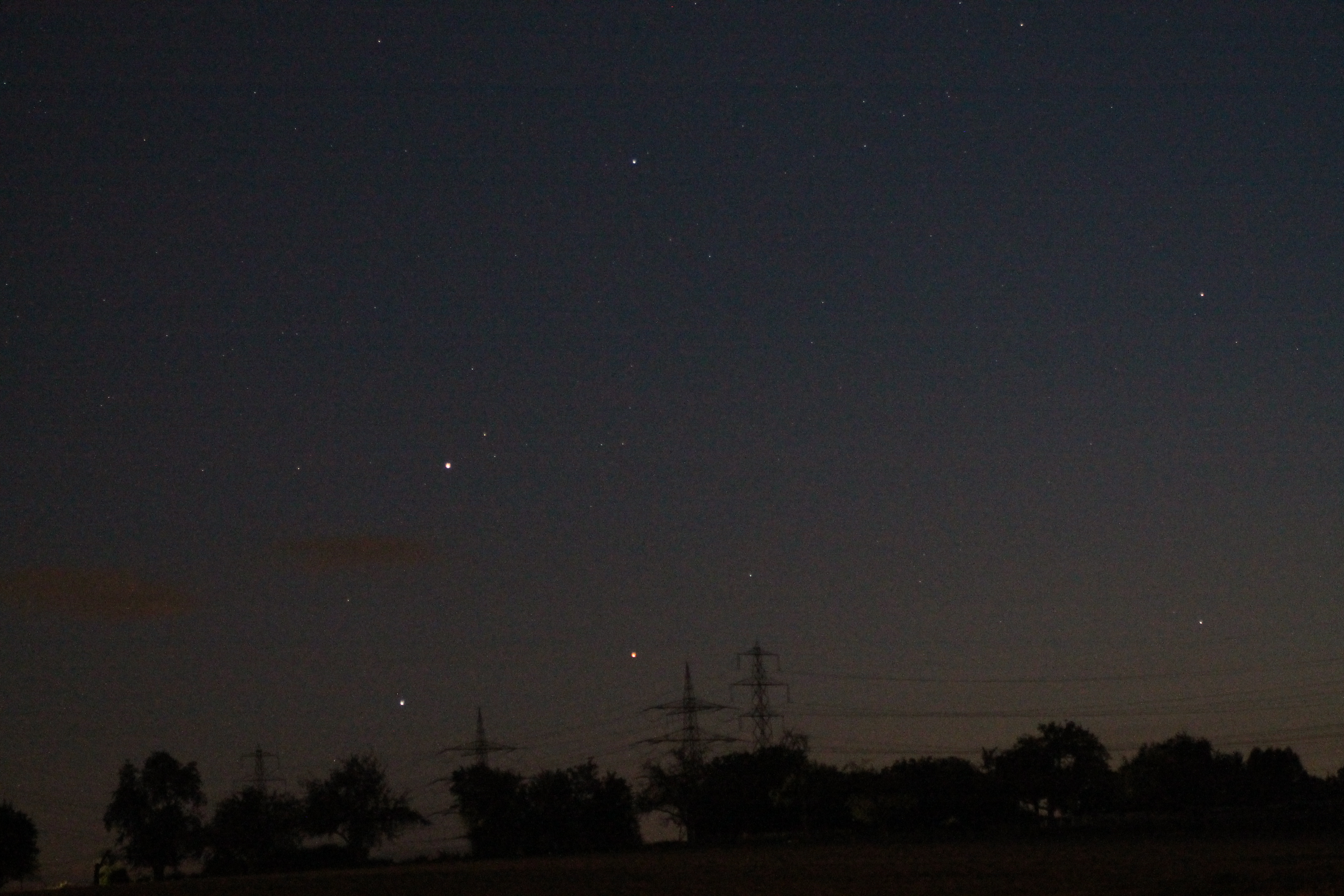 Mars (links von der Spitze des rechten Abzweigmasts), Spika (links von der Spitze des linken Abzweigmasts) und Saturn bilden ein gleichseitiges Dreieck am Abend des 7. August 2012.