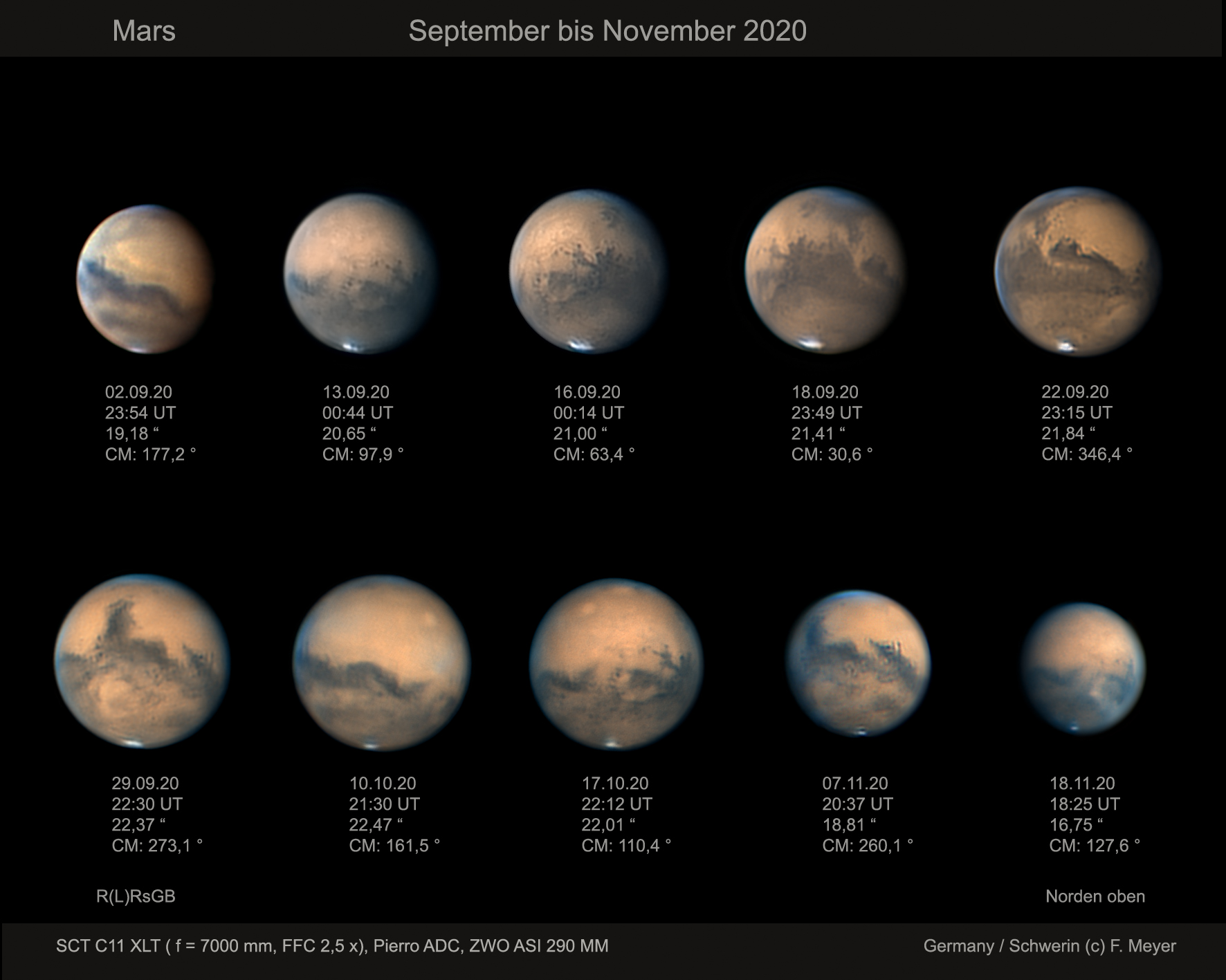 Zusammenstellung einiger Marsaufnahmen der diesjährigen Beobachtungsperiode. Alle Aufnahmen sind mit einem SCT C11 bei 7000 mm Brennweite und einer ZWO ASI 290 MM mit der Software FireCapture aufgenommen worden. Weitere Angaben in der Darstellung.