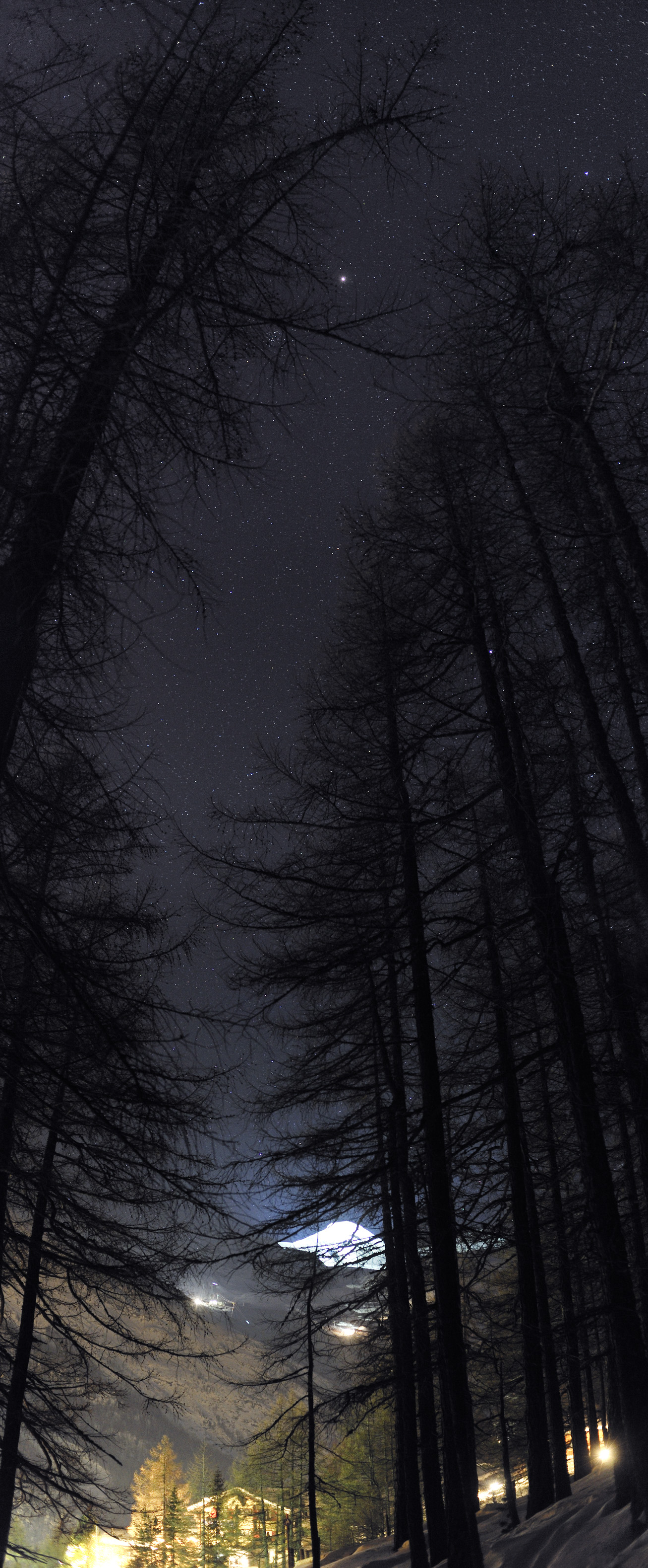 Das über 4000 m hohe Allalinhorn im Wallis wird in der Nacht hell erleuchtet. Welch ein Beispiel für Lichtverschwendung und -verschmutzung! Nicht für Skifahrer, nein, es soll einfach nur "toll" aussehen als Touristenmagnet. Der Gipfel war auch prompt überbelichtet.