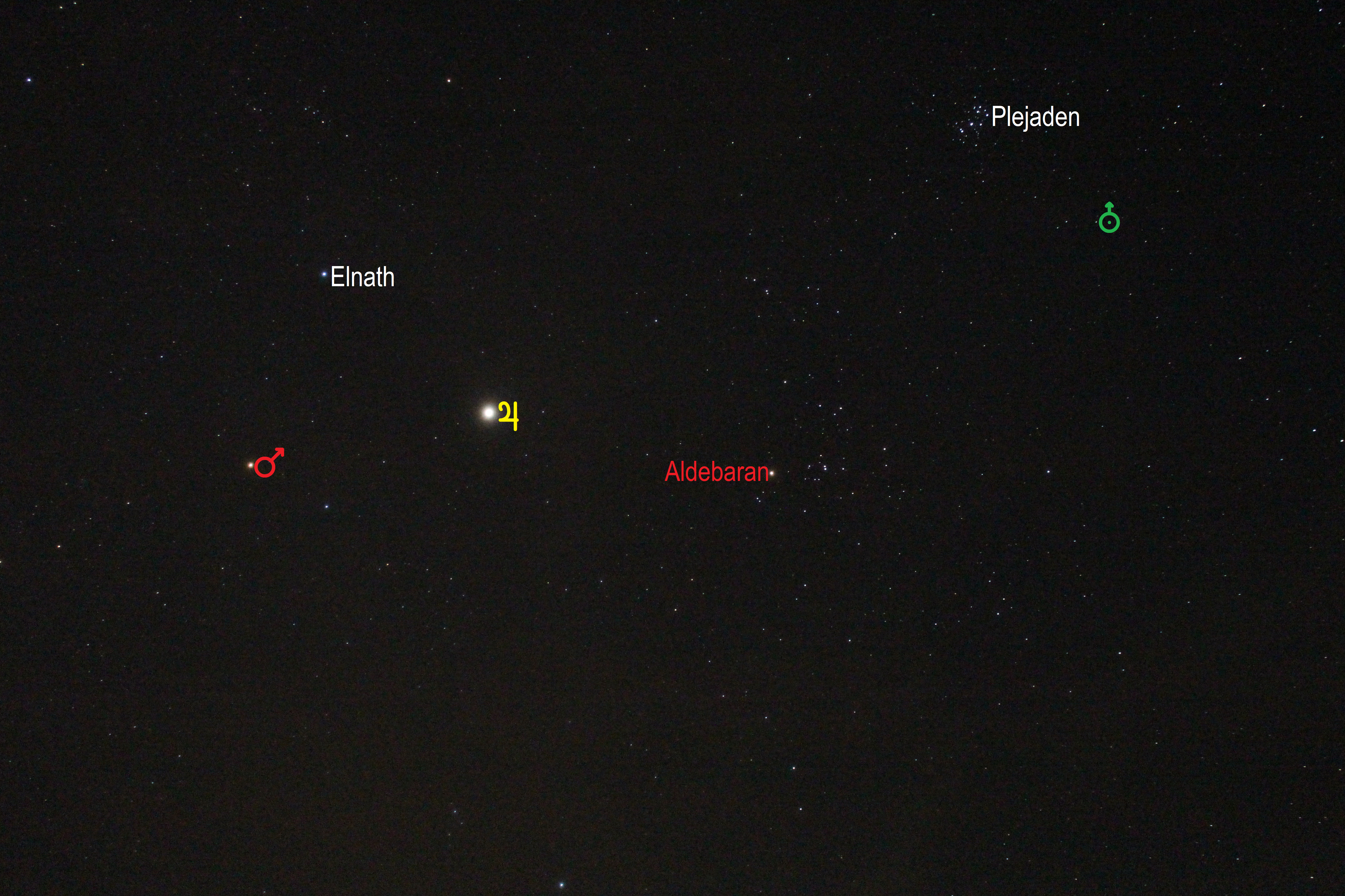 Leserbilder Astronomie: Mars und Jupiter im Sternbild Stier (Objekte beschriftet)