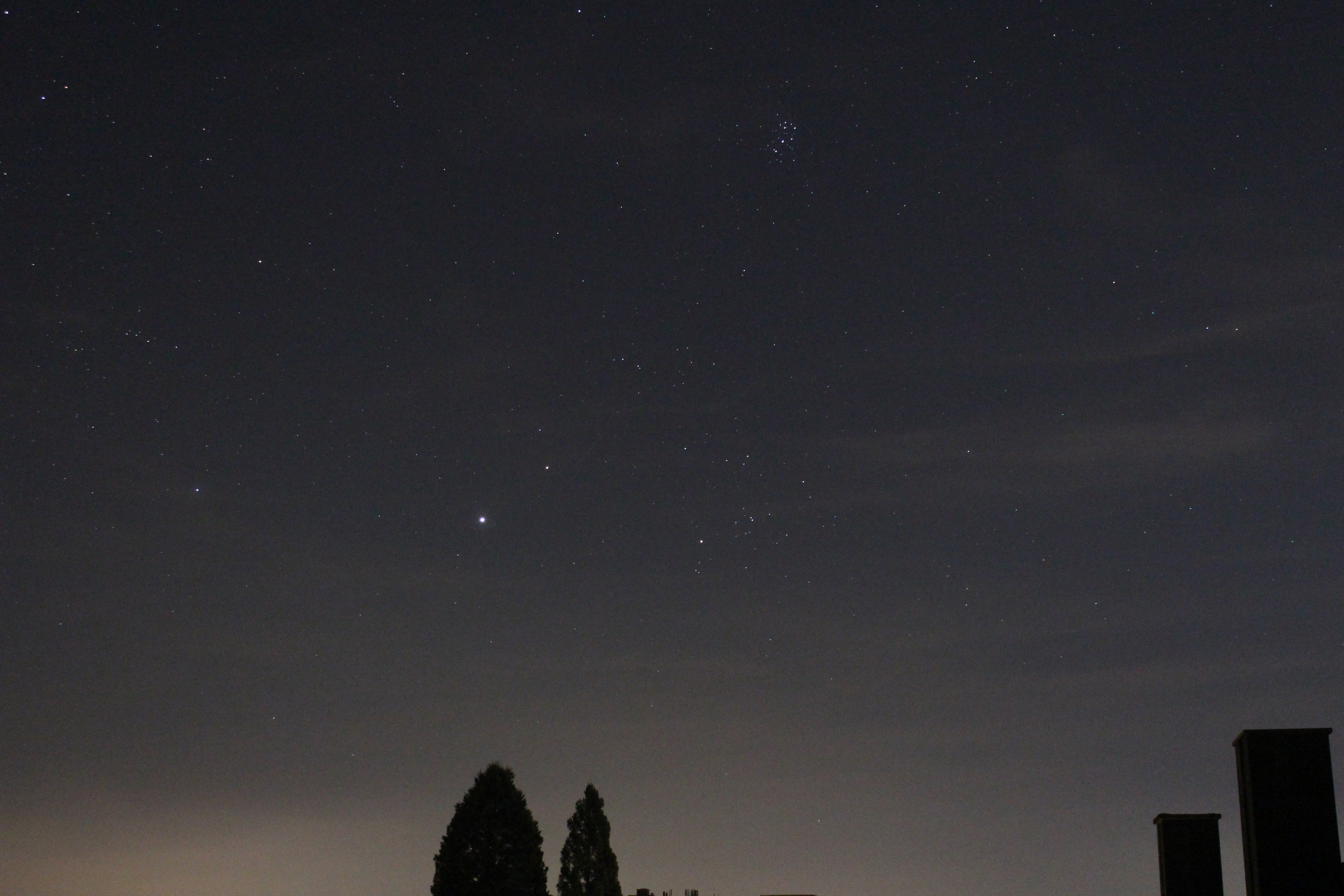 Mars und Jupiter im Sternbild Stier über dem Sindelfinger Ortsteil Maichingen.