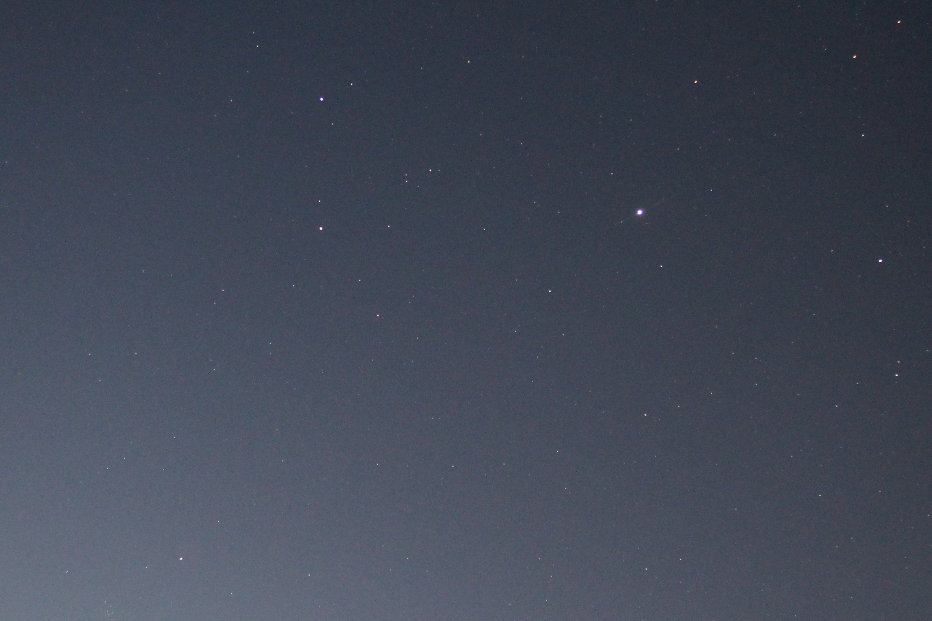 In der beginnenden Morgendämmerung des 4. September 2013 habe ich das Sternbild Zwillinge fotografiert mit den Planeten Mars (am unteren Bildrand links) und Jupiter (hellstes Objekt auf dem Bild).
