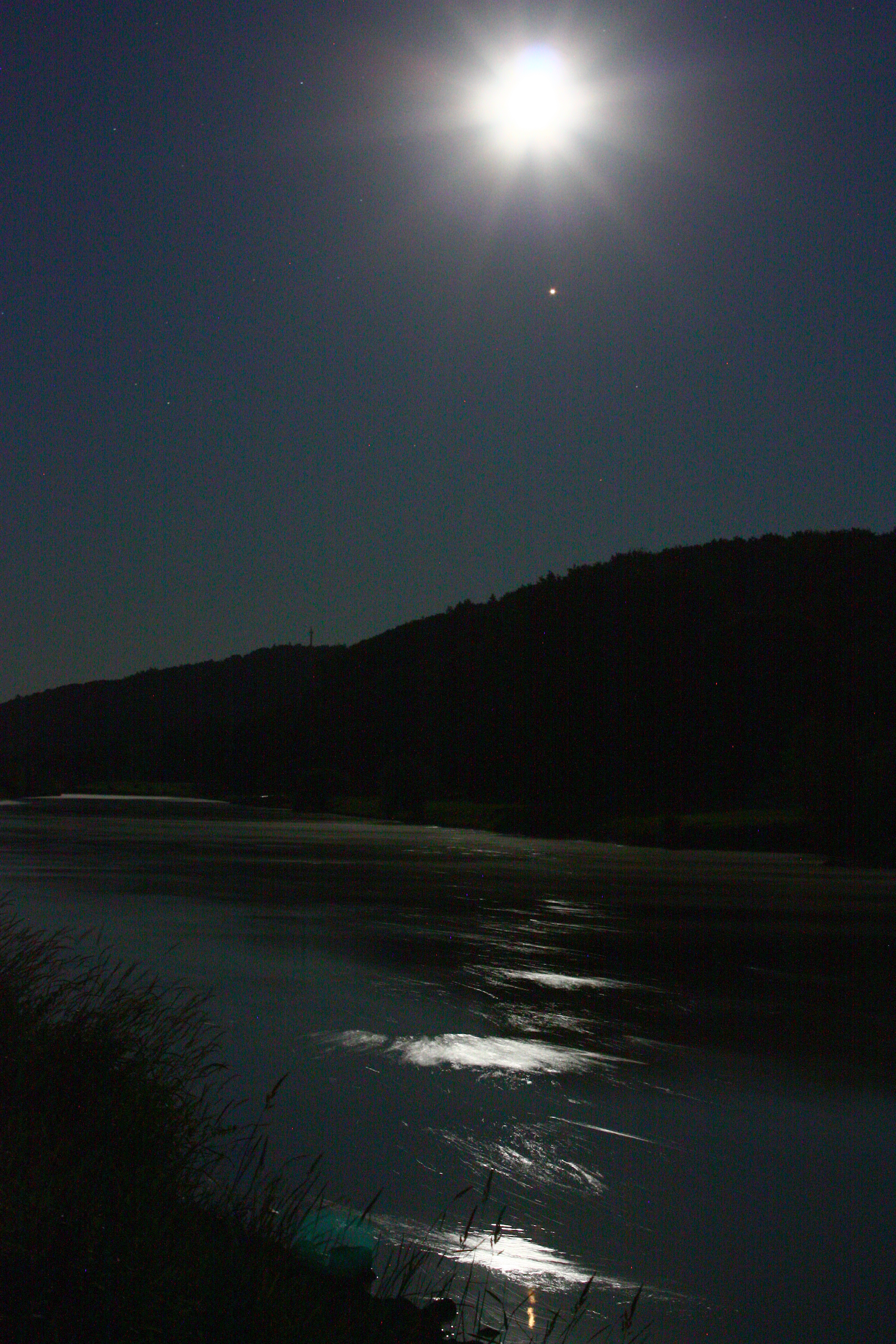 Der inzwischen schon recht hell gewordene Mars und der fast noch volle Mond näherten sich in der Nacht vom 30. Juni auf den 1. Juli 2018 bis auf vier Grad. Ein stimmungsvolles Motiv ergab sich mit den beiden Himmelskörpern, als sich der - hier naturgemäß überbelichtete - Mond in zahllosen Reflexen auf der Weser nahe der Rattenfängerstadt Hameln spiegelte.