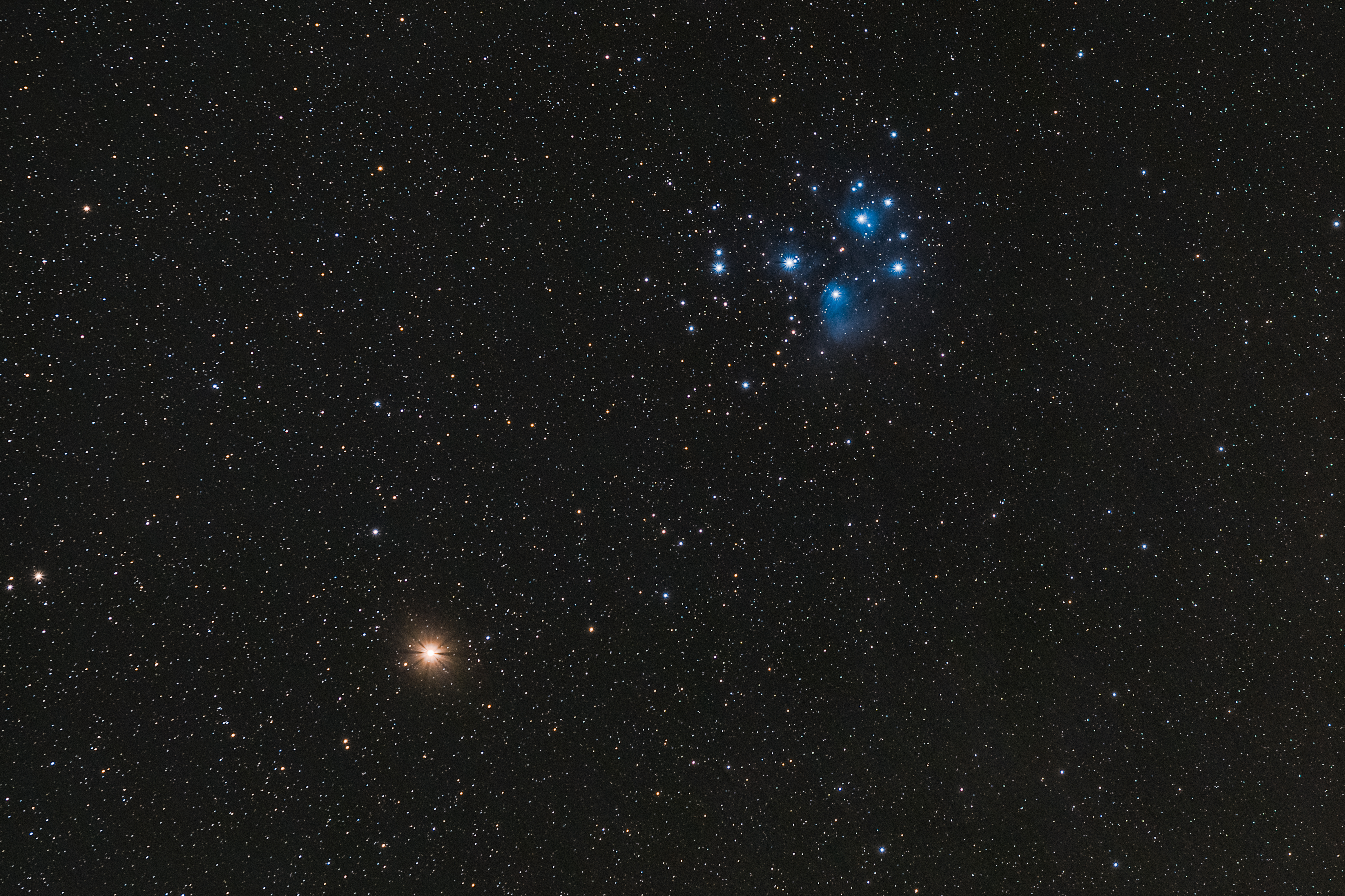 Zu sehen ist der Planet Mars in scheinbarer Nähe zu den Plejaden.