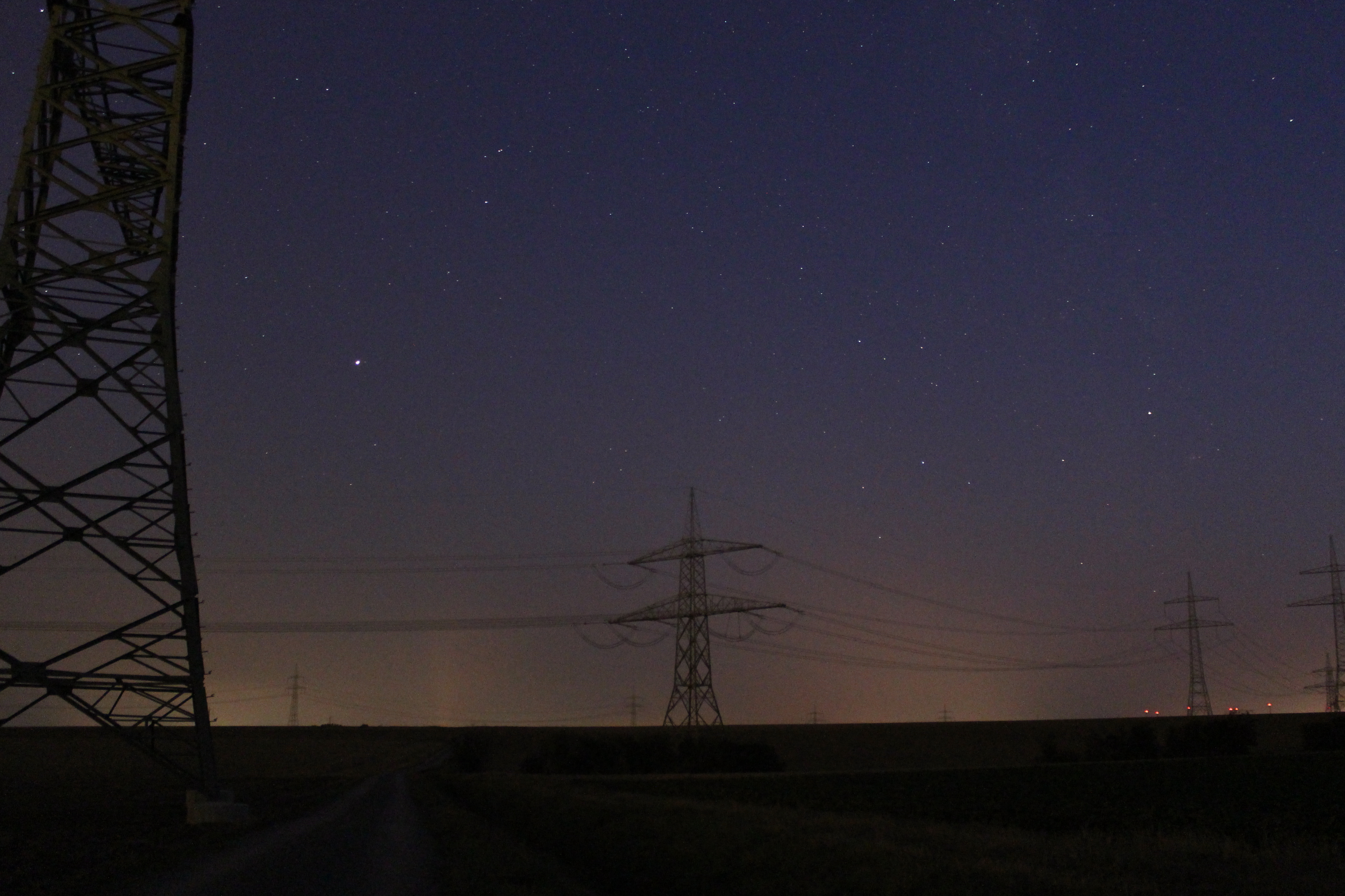 Mars im Steinbock und Saturn im Schützen mit diversen Hochspannungsleitungen südlich des Umspannwerks Bergrheinfeld im Vordergrund.