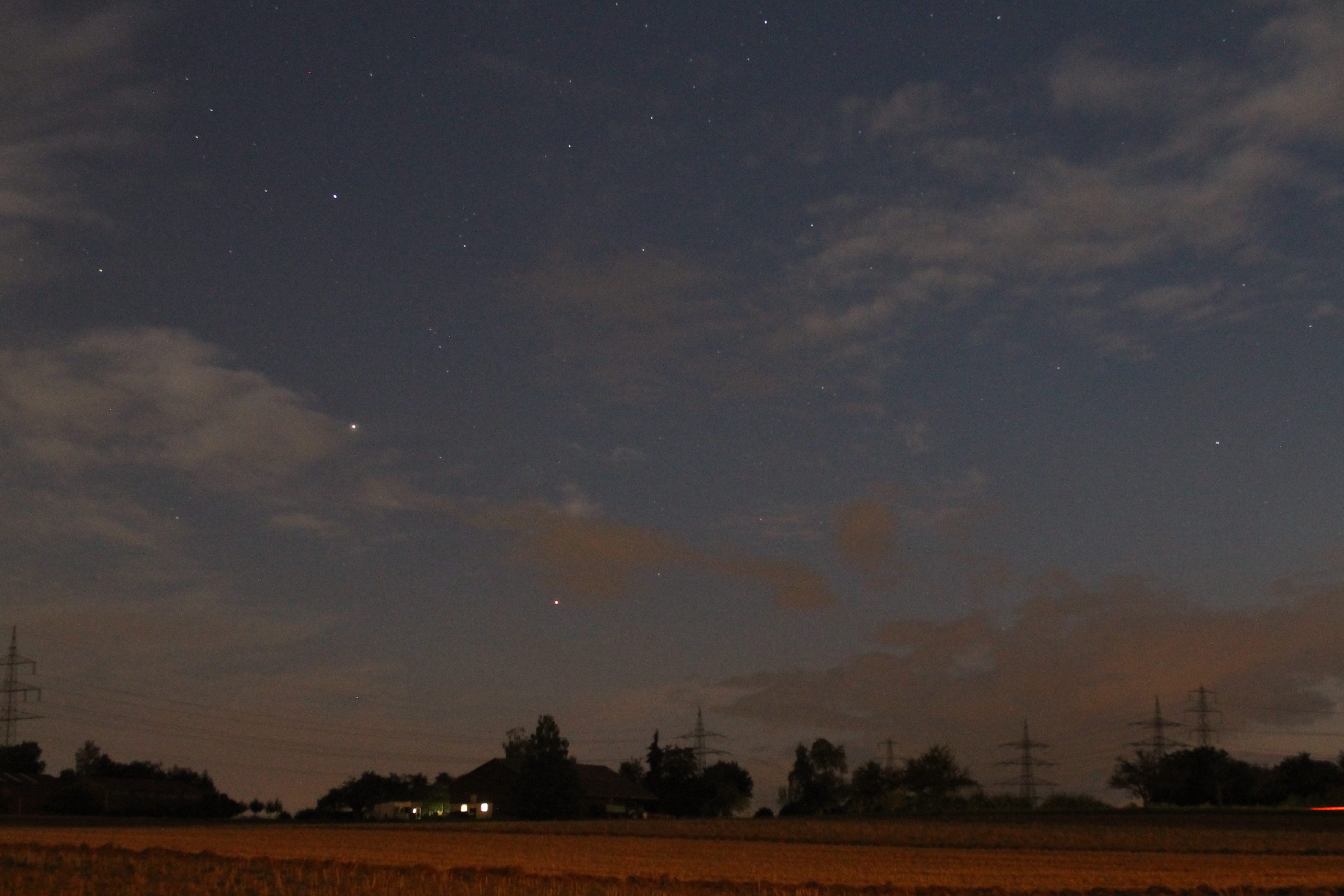 Am Abend des 12. August 2014 konnte ich endlich wieder die beiden Planeten Mars und Saturn fotografieren, deren gegenseitiger Winkelabstand schon beachtlich kleiner wurde.