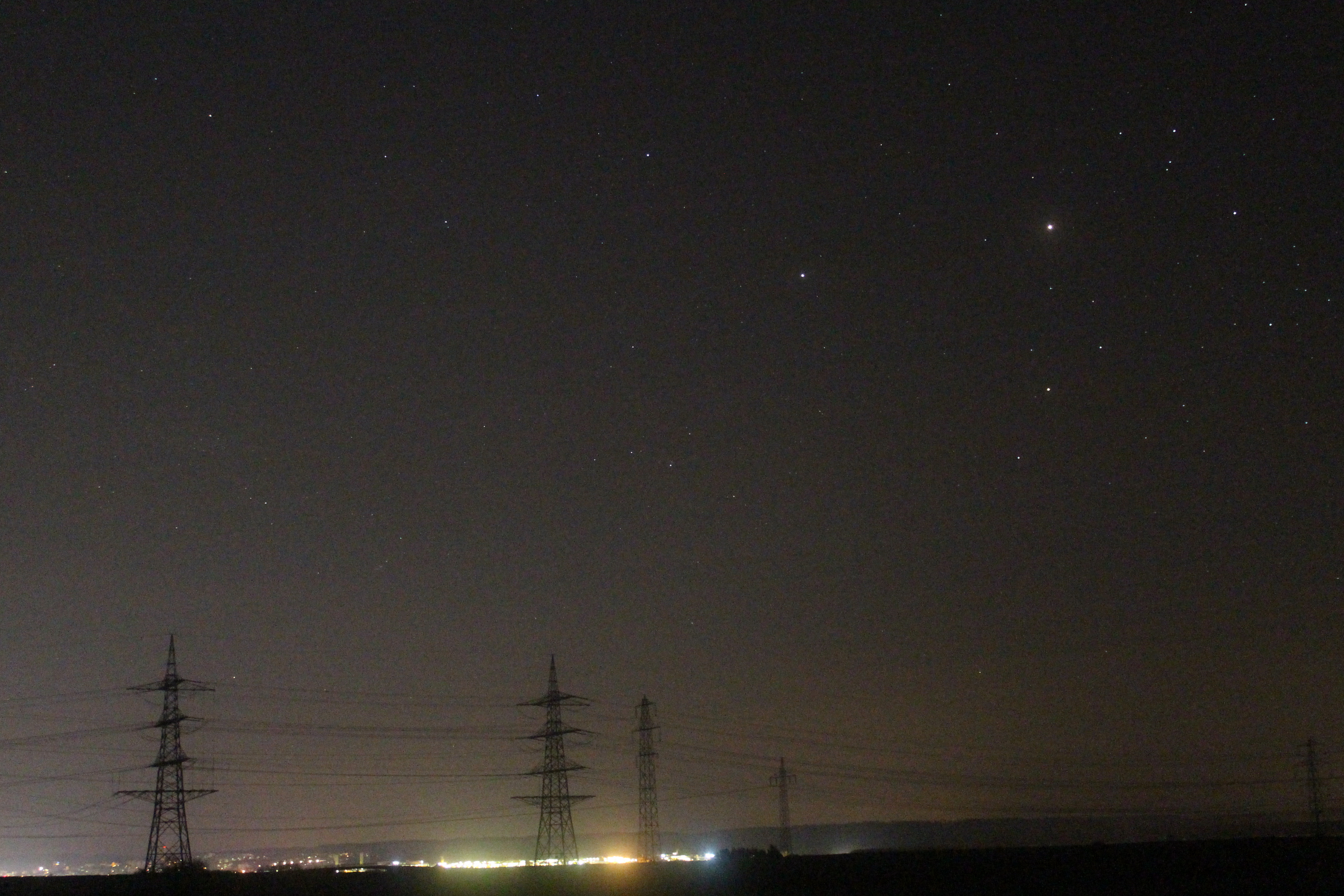Mars und Saturn über den beiden Masten, an denen die 110-Kilovolt-Stichleitung zum Umspannwerk Sindelfingen von der 380/110-Kilovolt-Leitung Pulverdingen-Oberjettingen abzweigt. Obwohl die Nacht sehr klar ist, ist die Sicht in unmittelbarer Horizontnähe schlechter als erwartet.
