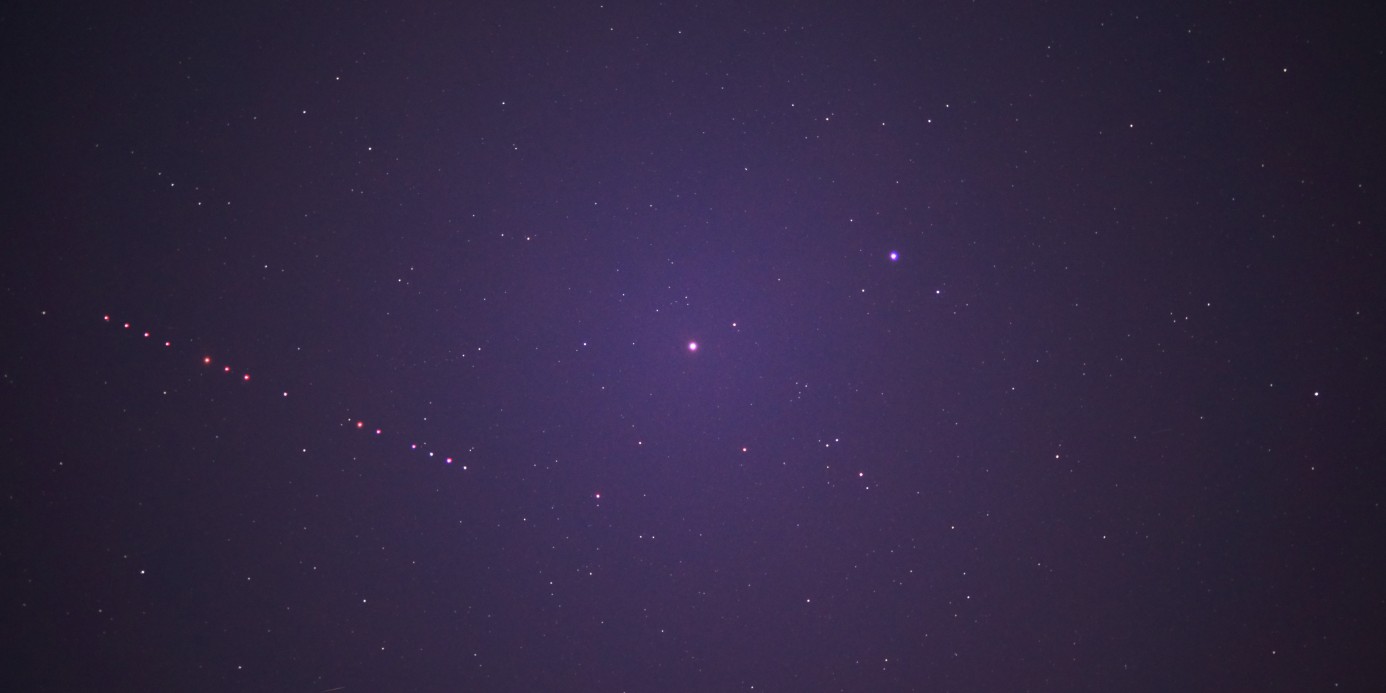 Vom 9. bis 28. April 2025 konnte ich fast täglich den Mars fotografieren, wie er an Castor und Pollux vorbeizog. Das Kompositbild zeigt die Bewegung des Wandelsterns sehr augenfällig. Durch die Addition der Bilder erscheint Mars allerdings leuchtschwächer, als er es tatsächlich war.