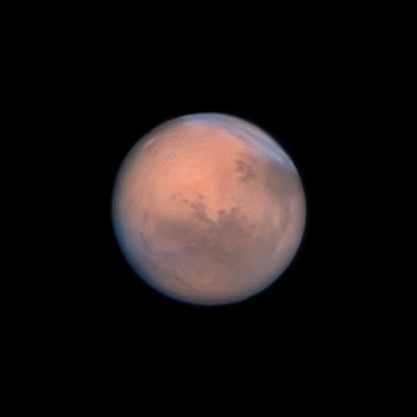 Nachdem ich eine Deep-sky-Session fotografiert hatte und das Guiding recht sauber lief, das heißt das Seeing recht ordentlich war, entschied ich mich noch für einen Versuch an Mars. Trotz der eisigen Kälte von -10°C, habe ich die Kamera getauscht und die Baader FFC mit dem Greatstar ADK montiert. Die Bearbeitung der Aufnahme habe ich bewusst sehr dezent durchgeführt, um den visuellen Eindruck am Okular zu erhalten. Zum Einsatz kam mein 12"-Newton-Cassegrain (Eigenbau).