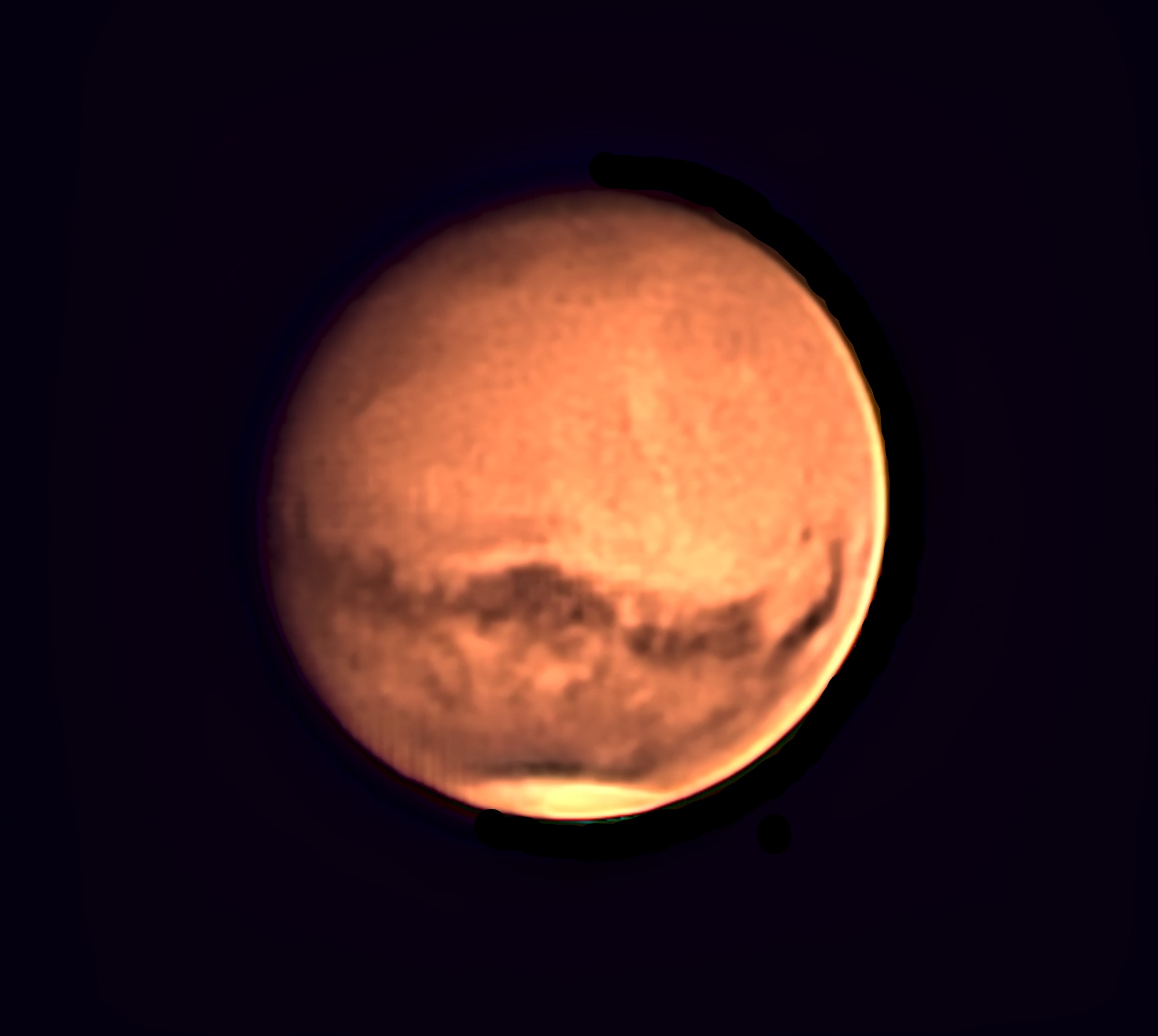 Das ist das Foto, von dem ich die Marskarte erstellt habe. Das Negative bei der Aufnahme war, dass durch die tiefe Stellung die untere Sternwartenklappe den halben Spiegel abgedeckt hat.