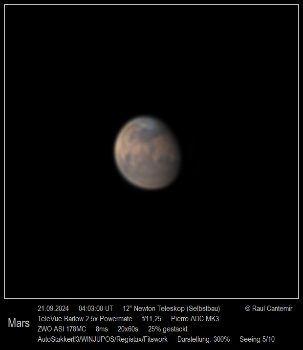 Ich habe dieses Bild mit einem 300-Millimeter-Newton-Teleskop unter durchschnittlichen Seeing-Bedingungen aufgenommen. Auf diesem Foto sind auf der Oberfläche Arabia Terra und Valles Marineris zu sehen. Die verkraterte Hochlandregion Arabia Terra liegt nördlich des Äquators des Planeten Mars. Und die Valles Marineris sind eines der größten Grabenbruchsysteme unseres Sonnensystems.