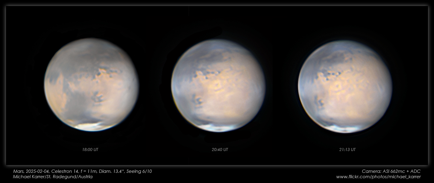 Gutes Seeing ist bei diesem kleinen Planetendurchmesser enorm wichtig – und das war zeitweise an diesem Abend endlich der Fall. Relativ viel Dunst ist zu erkennen, im Osten ragen zwei Tharsis-Vulkane durch dünne Wolkenschichten. Die Polkappe hat eine dunkle Einlagerung. Staub oder beginnender Prozess des Abschmelzens
