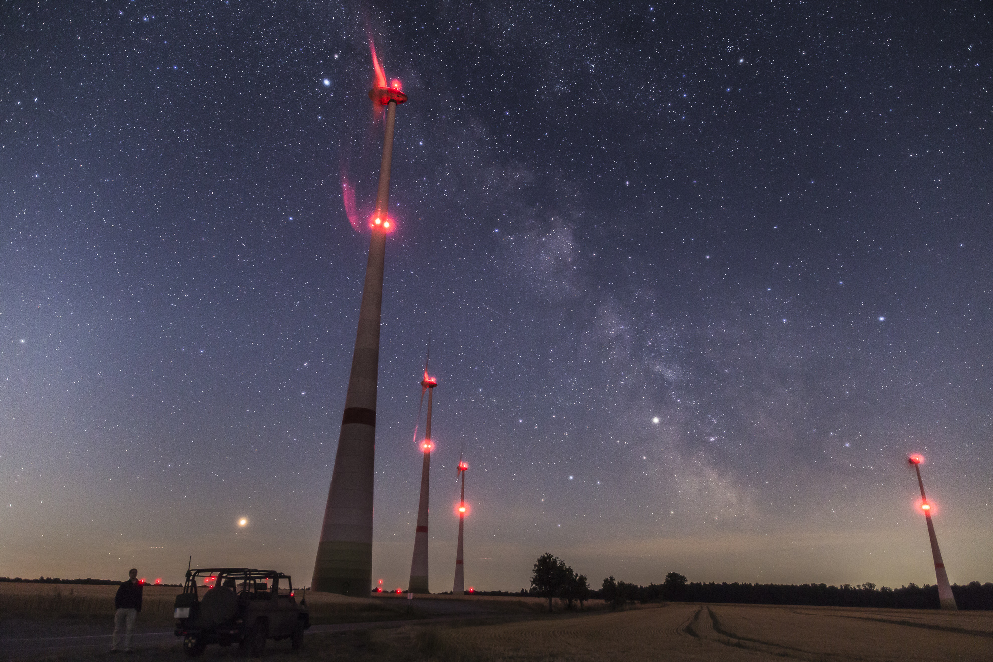 Beobachtung des Marsaufgangs am 3. Juli 2018 kurz vor Mitternacht. Im Vordergrund die Lichter der Windkraftanlagen im Kreis Paderborn. Im Hintergrund die Lichter der Sommermilchstraße. Im Sternbild Schütze ist Saturn gut zu erkennen. Es handelt sich um eine Einzelaufnahme.
