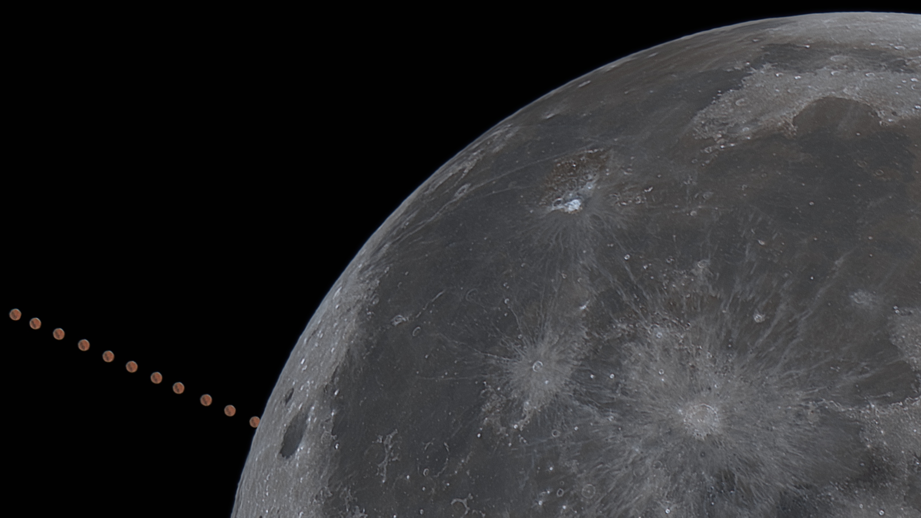 Nachdem der Morgen am 8. dezember 2022 durch extrem klares Wetter überraschte, gelangen mir nach hektischem Aufbau des Teleskops über 500 Einzelaufnahmen im Abstand von je zwei Sekunden. Nach einem Zeitraffer Video und einer Collage mit dem Mond als Komplettaufnahme war nun die Frage, ob aus den vielen Bildern auch ein Detailbild Sinn machen würde. Dazu fügte ich etwa 400 Bilder zusammen, bei denen ich den Planeten vorher ausgeschnitten hatte. Die Nutzung von 50% der Fotos ergab das beste Bild des Mondes daraus. Ähnlich verfuhr ich dann mit dem Mars an verschiedenen Zeitbereichen und fügte schließlich alles zu einem Ausschnittbild zusammen.