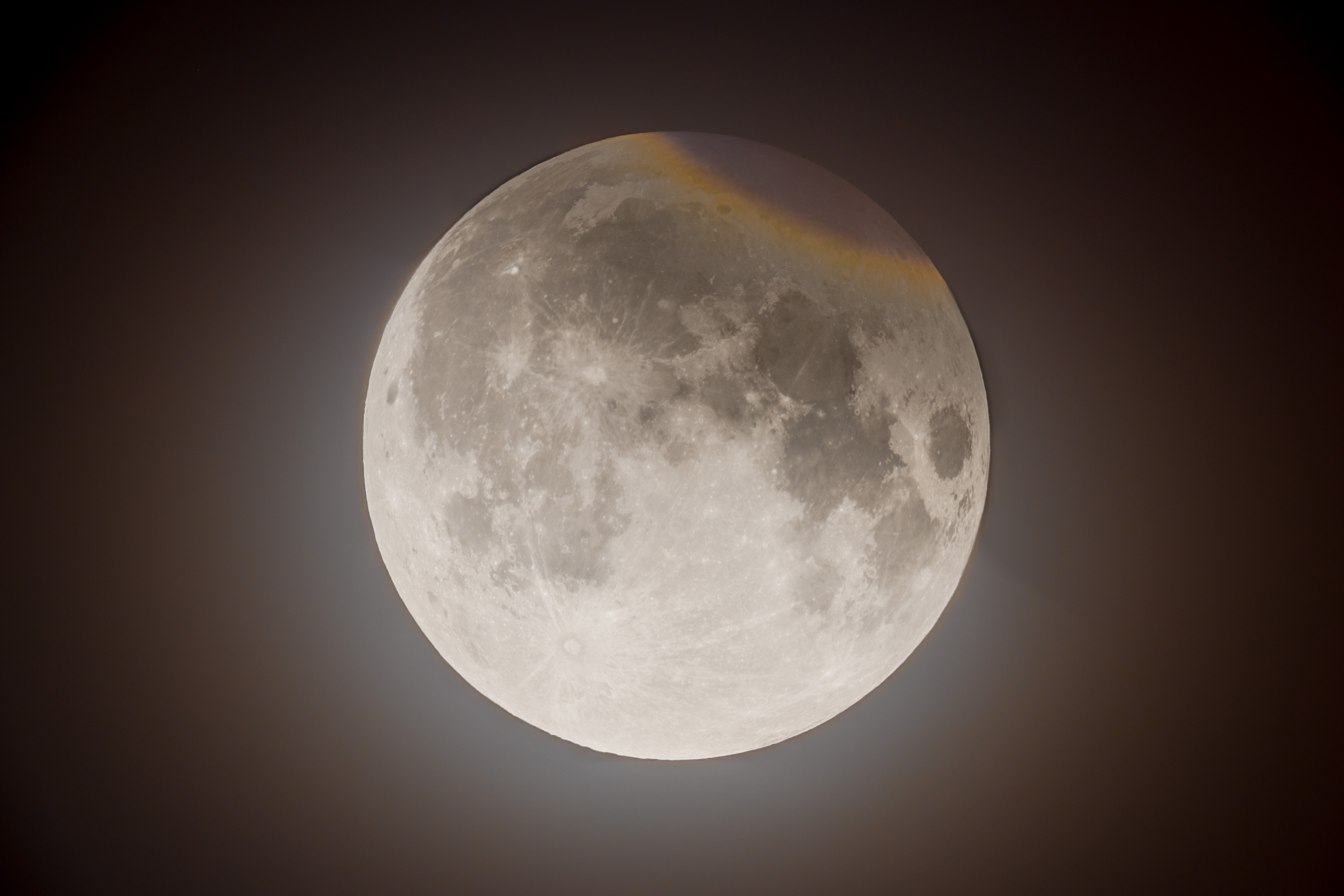Komposit aus drei Aufnahmen der partiellen Mondfinsternis am 18. September 2024. Die schattennahen Bereiche sind farbverstärkt.