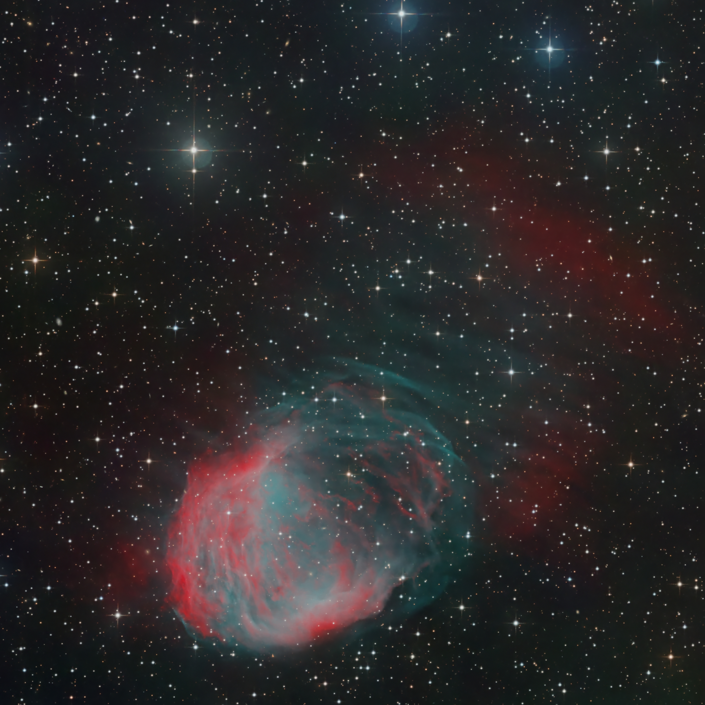 Abell 21 oder Sharpless 2-274, auch bekannt als Medusa-Nebel ist ein ausgedehnter Planetarischer Nebel im Sternbild Zwillinge nahe der Ekliptik. Seinen Namen verdankt der Nebel den schlangenartigen roten Gasfilamenten, die an das Haar der Sagengestalt Medusa erinnern. Neu in der bisherigen astrofotografischen Darstellung ist die Dokumentation der blau-grünen Stoßwellen aus OIII im nördlichen Außenbereich,