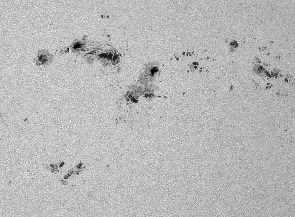 Die Fleckengruppe vom 18. April 2024 um 08:03UT besteht aus der Nr. 13638, eine C-Gruppe; der Nr. 13643, eine F-Gruppe und der Nr. 13645, einer D-Gruppe. Das Wetter (wolkenlos nach einer kalten Nacht) war ausreichend gut, um mit dem 4-Zoll-Refraktor die Granulation zu erkennen