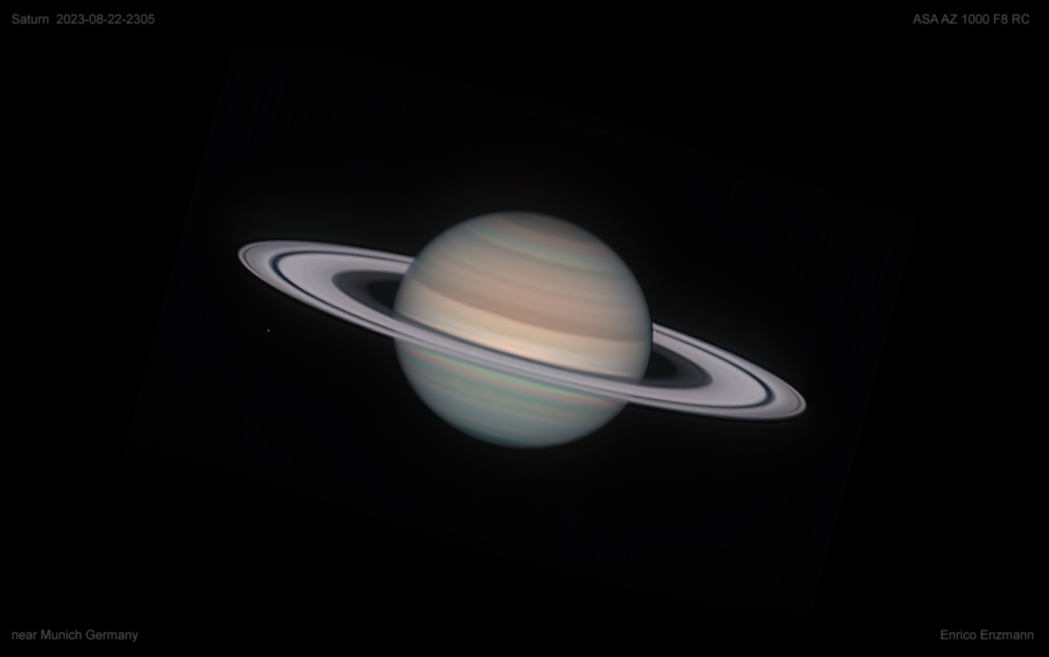 Am 24. August 2023 hatte ich hier ein gutes Saturnbild veröffentlicht. Ganz zufrieden mit der Bildqualität war ich nicht und habe mich deswegen nochmals an das Rohmaterial gemacht. Die Neurechnung war extrem zeitaufwendig da ich alle Farbkanäle separat bearbeitet habe und auch noch neue Techniken eingesetzt habe. Resultat ist mein bisher bestes Saturnbild das ich bis heute gemacht habe. Es zeigt nicht mehr den Grünstich der ersten Version, hat eine natürlichere Farbe, mehr Auflösung und man sieht mehr Wolkendetails. Es ist erstaunlich wie viel noch im Rohmaterial drin gesteckt hat und ein gutes Beispiel das man es immer wieder probieren sollte das Processing zu verbessern.