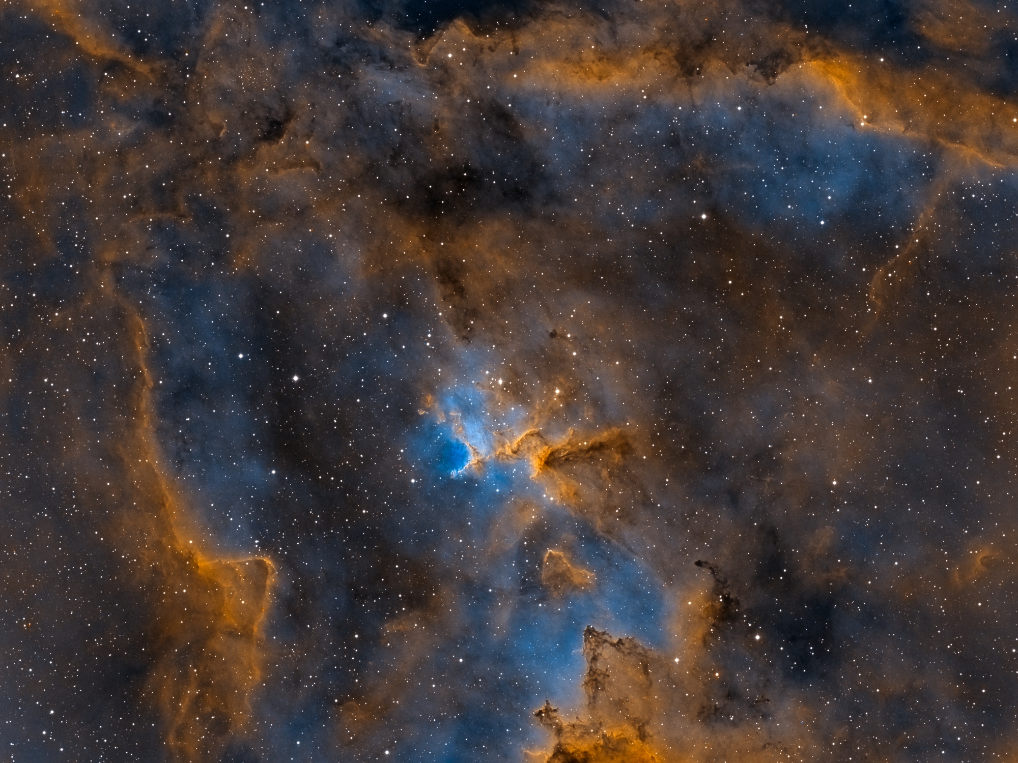 Es gibt denkbar unspektakulärere Orte für einen Sternhaufen im Universum als in einem herzförmigen Emissionsnebel eingebettet zu sein. Daher gönnte ich diesem Objekt entsprechende Belichtungszeit und für die Details passende Schmalbandfilter. Rausgekommen sind im Zeitraum Oktober/November 2018 rund 22 Stunden Gesamtbelichtungszeit (H-Alpha/SII/OIII 420/440/440 min).
