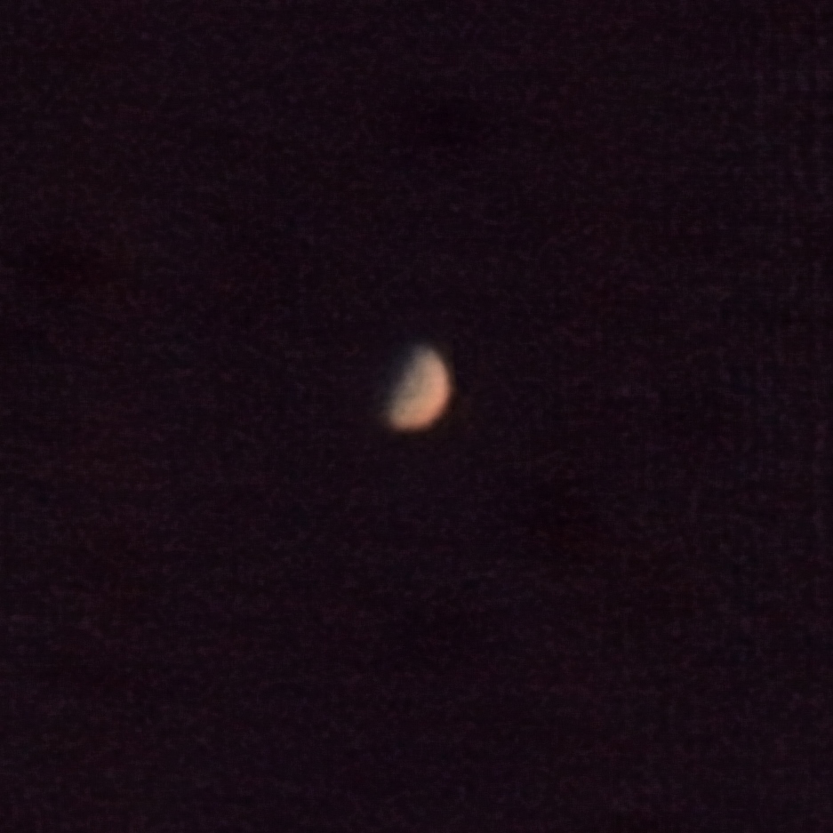 Ein einigermaßen gutes Foto des Planeten hinzubekommen, schien angesichts des in der Luftunruhe zappelnden Merkur eher unwahrscheinlich. Aber wenn schon mal alles eingestelltt ist, warum soll man es nicht versuchen. Dank dem Programm Autostakkert wurde es besser als erwartet.