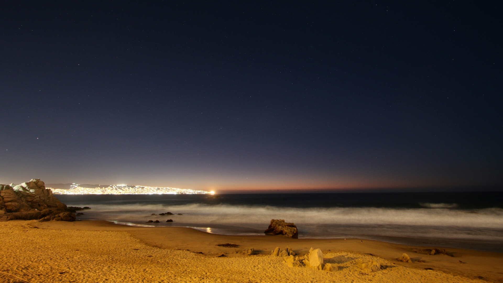 Merkur, aufgenommen am Abend des 21. November 2023 über der Bucht von Valparaiso in Chile. Links oberhalb von Merkur ist der Stachel des Skorpions und rechts davon das Sternbild Schütze zu erkennen. Links am Bildrand sind die beiden Sterne Alpha und Beta Centauri zu sehen.