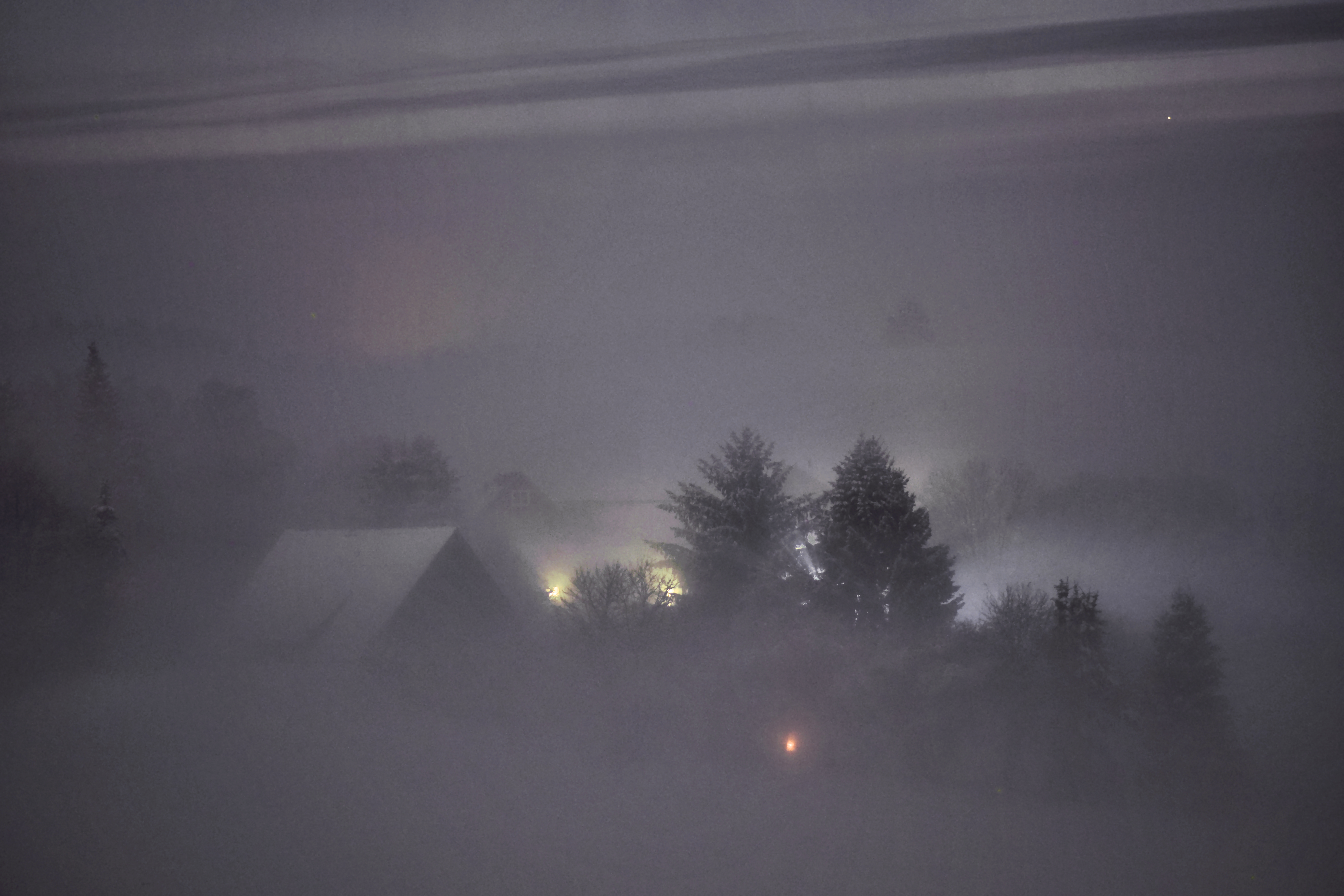 Über dem Raueisnebel einer Hofschaft in Halver blitzt noch kurz der Merkur hervor, bevor ihn der Dunst gänzlich verschluckt. Zum Zeitpunkt der Aufnahme stand Merkur nur noch 3° 52' über dem Horizont im WSW.