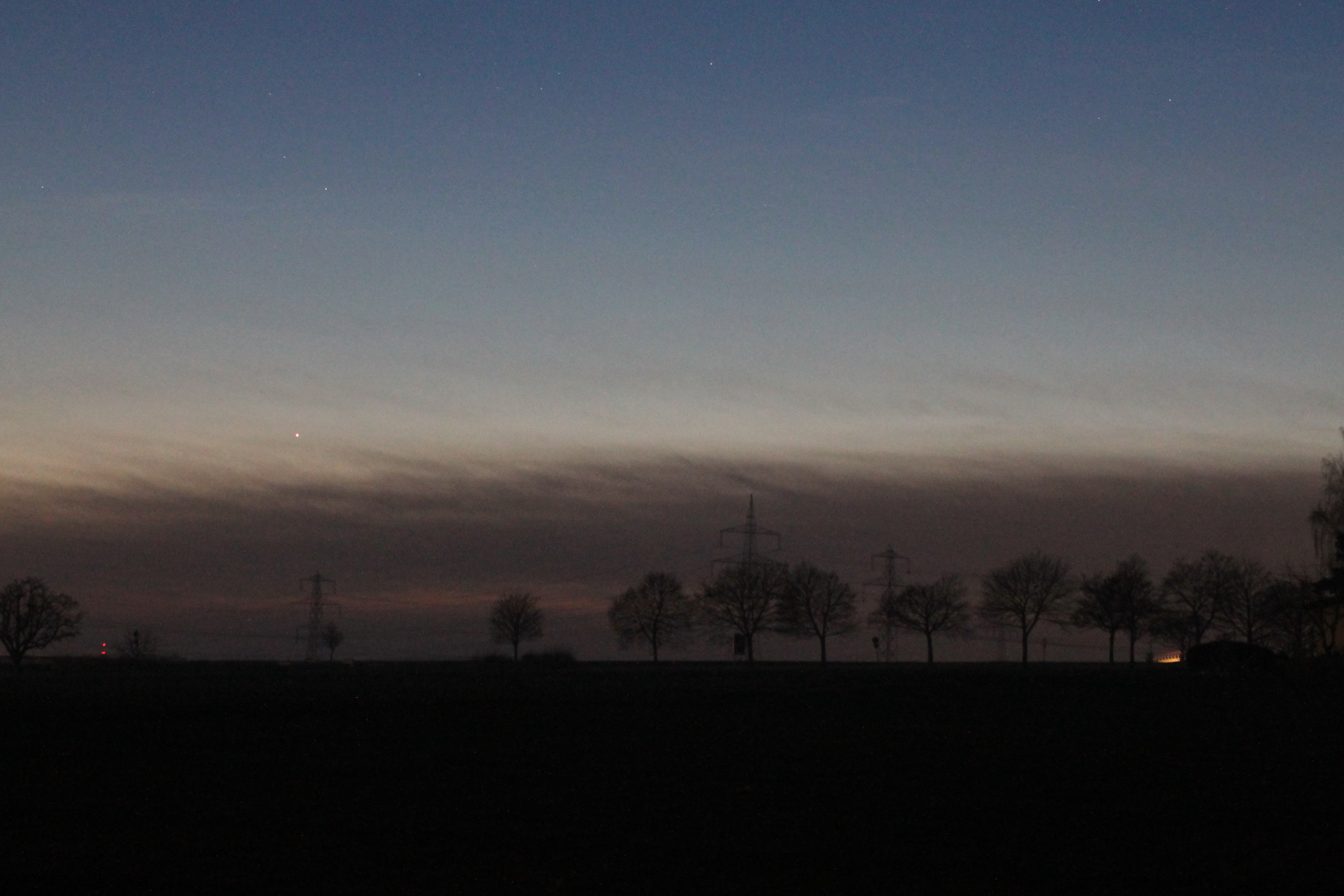 Am Abend des 31.1.2014 konnte ich Merkur in größter östlicher Elongation fotografieren. Ich wollte auch noch die Sichel des zunehmenden Mondes auf dem Bild festhalten, doch war diese wegen der horizontnahen Wolken nicht sichtbar.